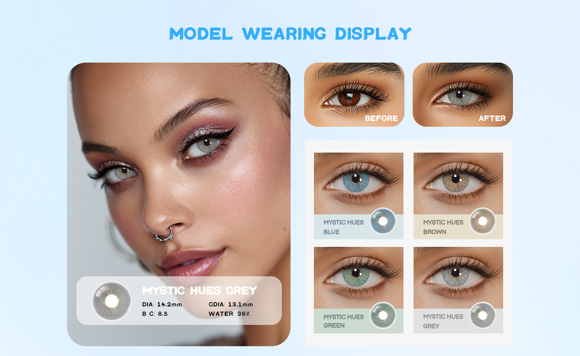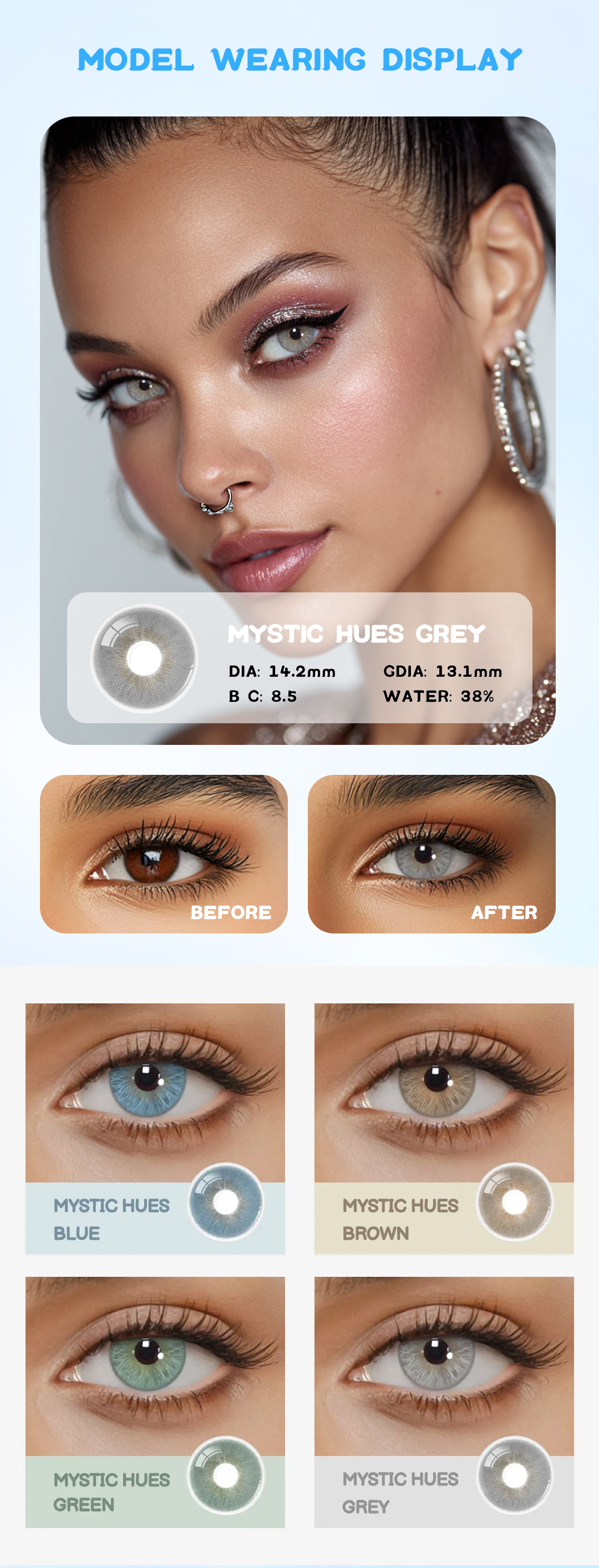 3.Cool, refined, and effortlessly modern, these gray contact lenses bring a soft clarity to your eyes without overpowering your natural look. The muted gray tones are carefully layered to blend seamlessly with your original eye color, creating depth and dimension with a smooth, realistic finish.