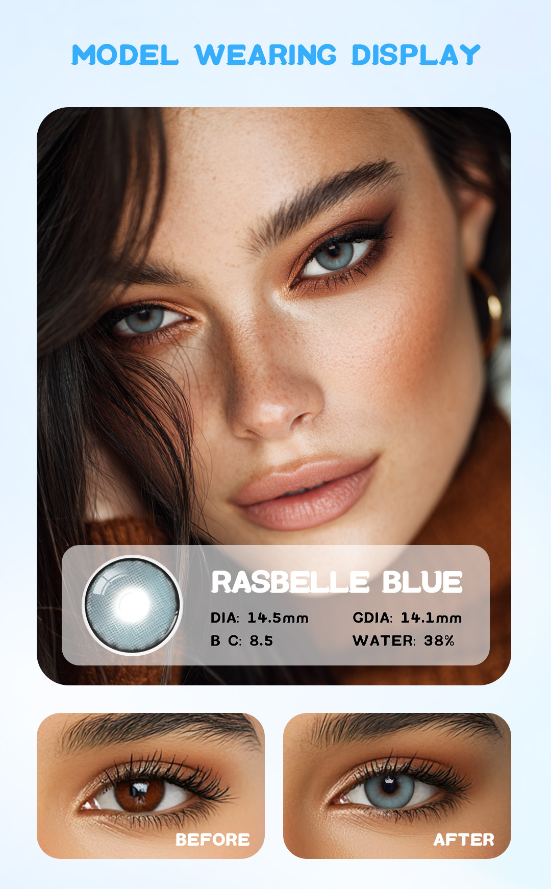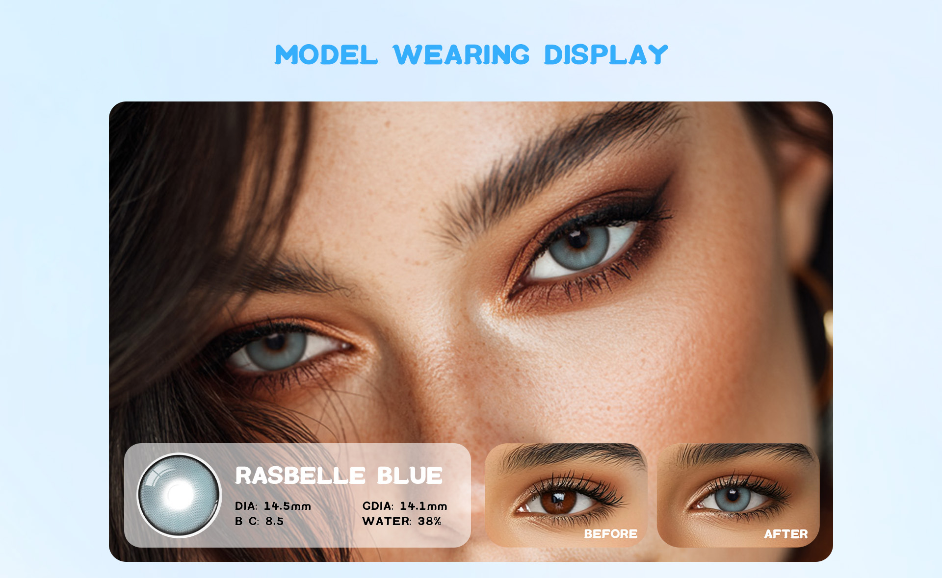 3.Step into a serene and natural look with Eyemua Rasbelle Blue contact lenses. Featuring a soft blue hue, these lenses gently enhance your eyes with subtle depth and a calm, luminous effect. Perfect for everyday wear, work, or casual outings, Rasbelle Blue gives your gaze a refreshing elegance that feels effortless and naturally captivating.