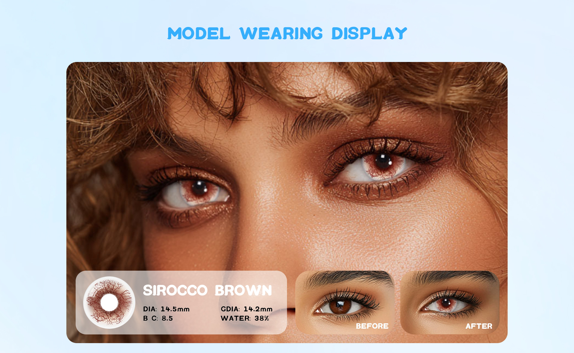 Eyemua Sirocco Brown lenses deliver a bold, warm brown hue with high contrast and sharp iris accents, enhancing any dramatic or fantasy role.
