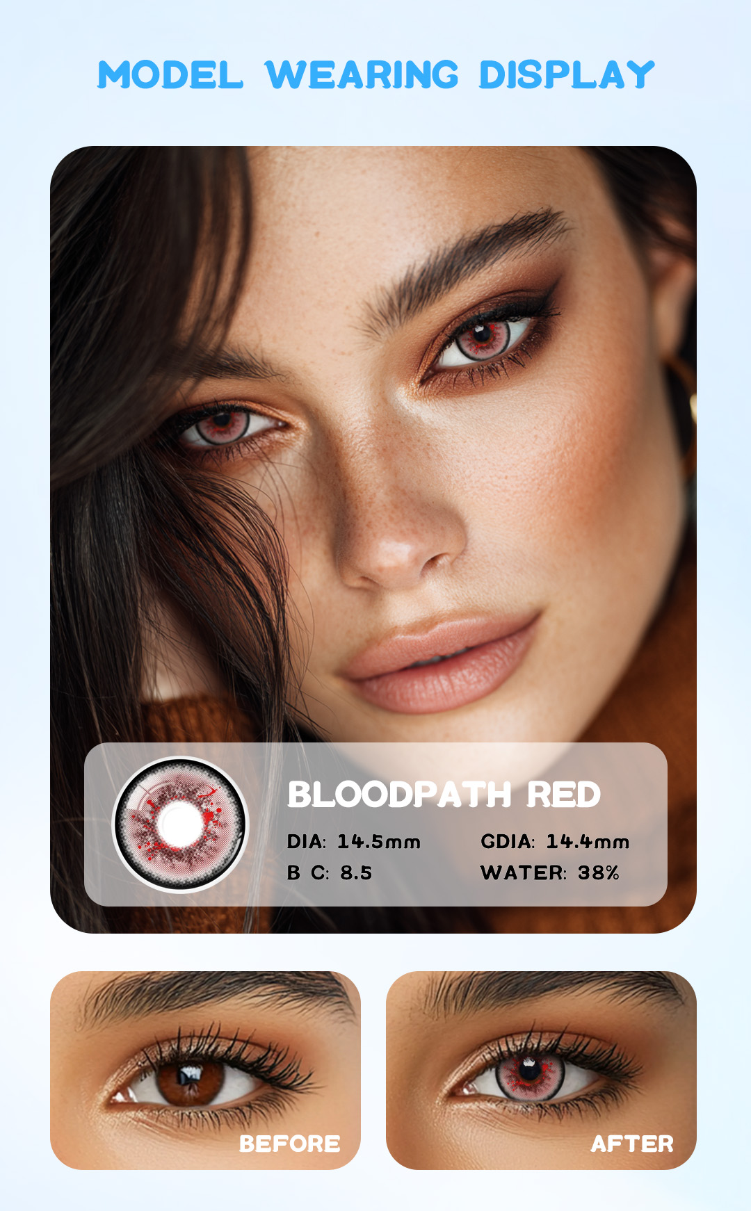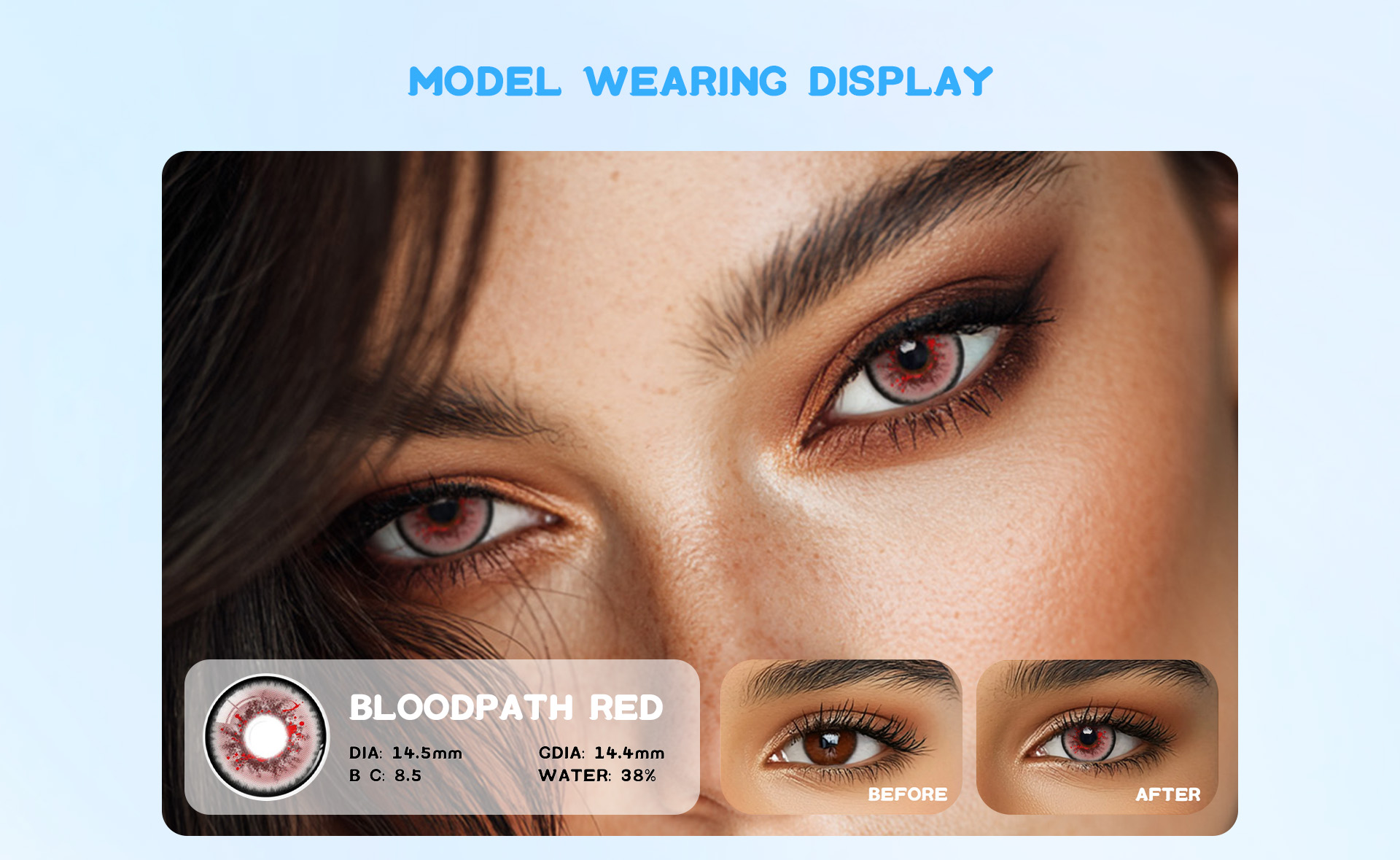 Embrace a bold, intense look with Bloodpath Red contact lenses, featuring a deep, fiery red hue that evokes strength and passion. These lenses create a captivating, dramatic effect, perfect for bringing fierce characters to life or adding a striking touch to your style. Let Bloodpath Red ignite your gaze and make a powerful statement wherever you go.
