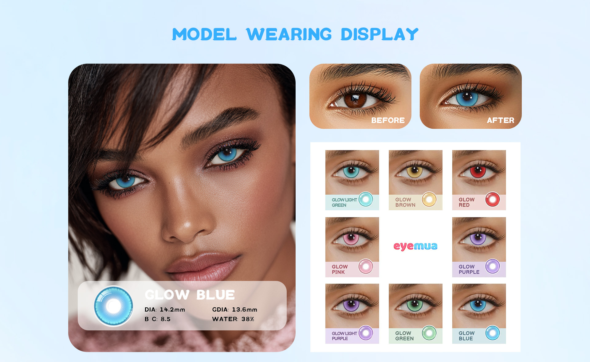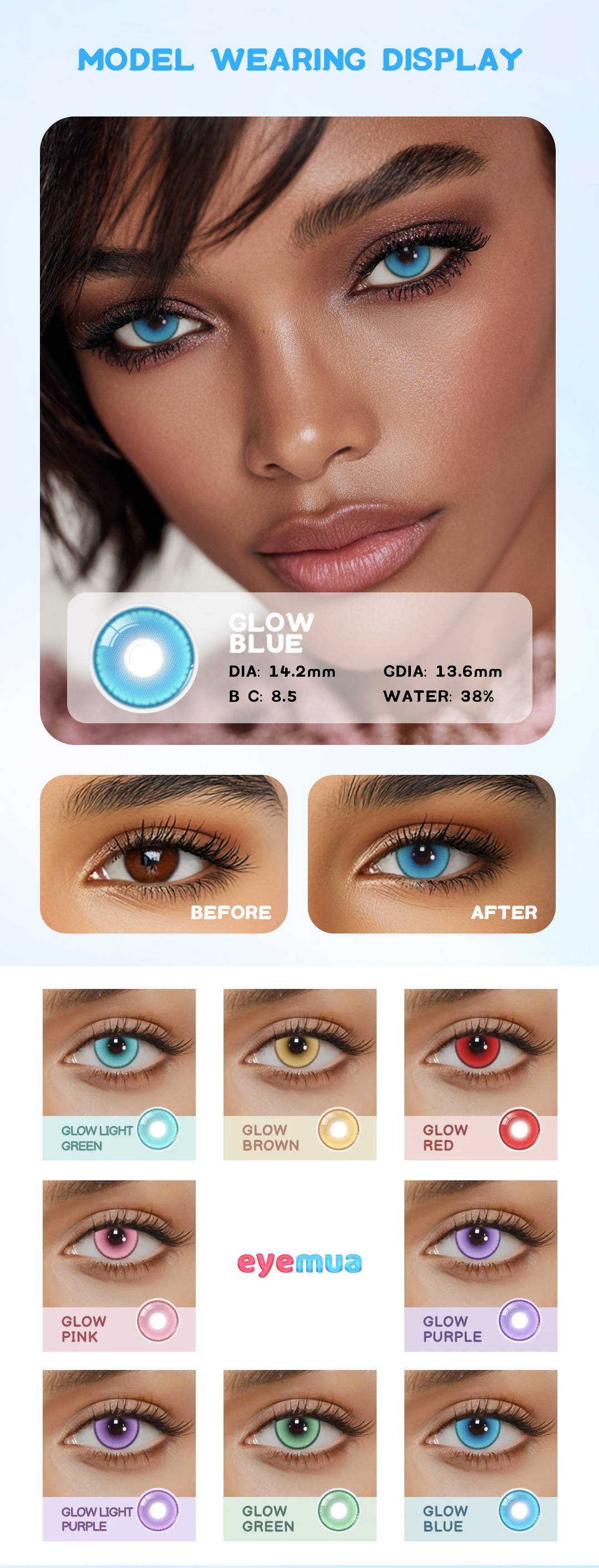 Illuminate your eyes with  Glow Blue contact lenses, featuring a brilliant blue hue that creates a striking, radiant effect. These lenses enhance your natural beauty with a vibrant pop of color, perfect for making your eyes the center of attention. Whether for cosplay or everyday wear,  Glow Blue adds a mesmerizing, glowing allure to your gaze.