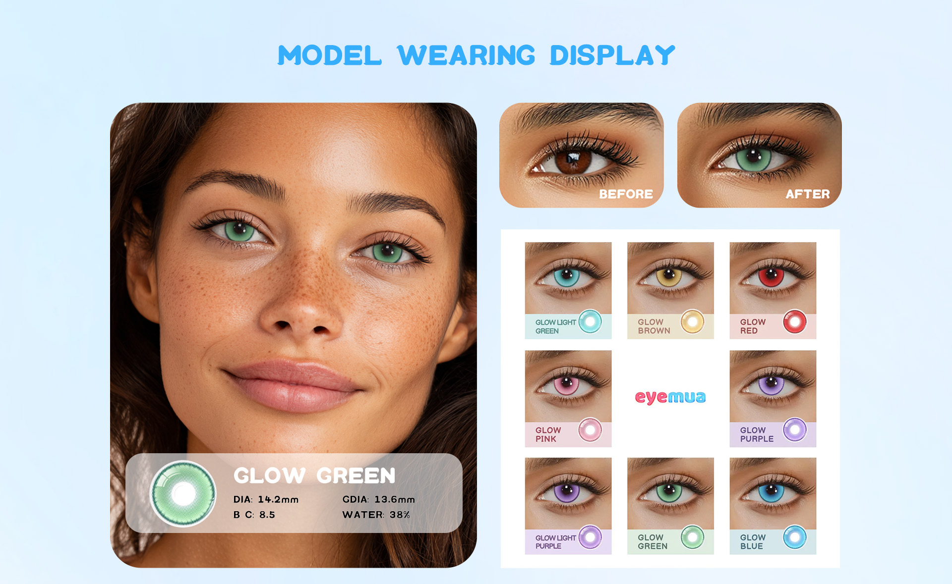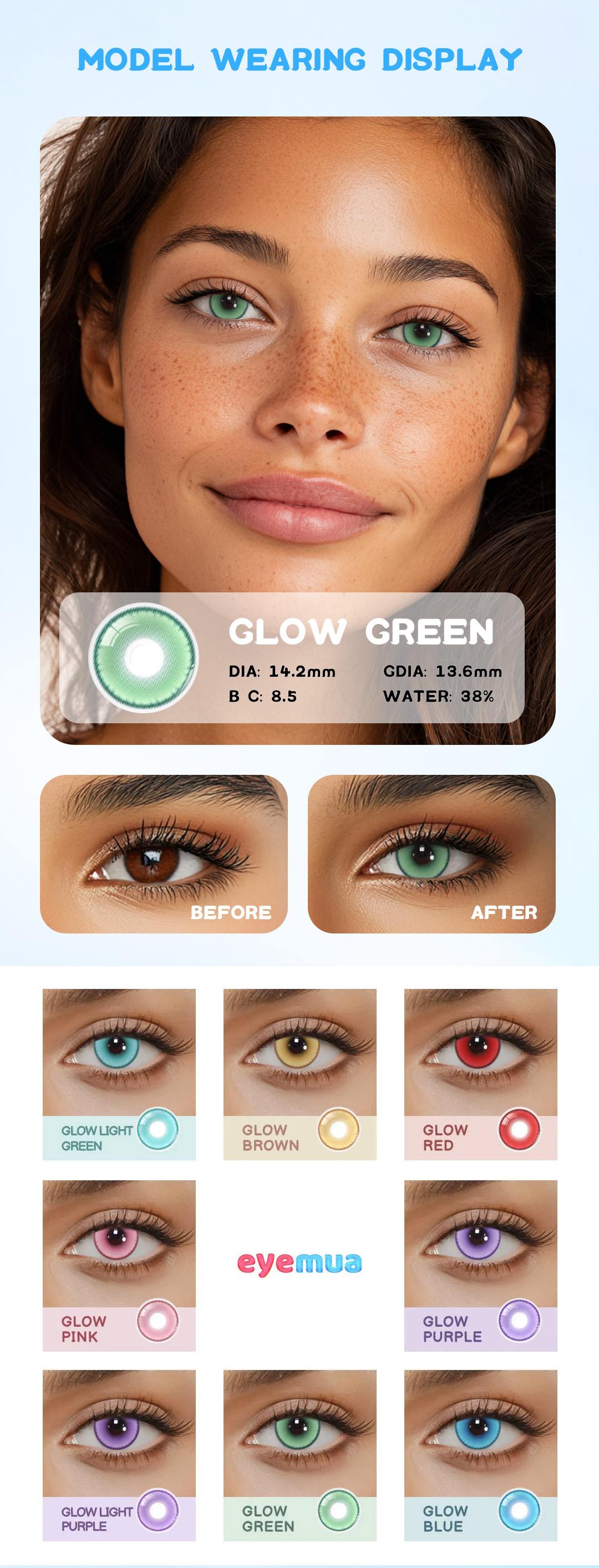 Illuminate your eyes with  Glow Green contact lenses, featuring a brilliant blue hue that creates a striking, radiant effect. These lenses enhance your natural beauty with a vibrant pop of color, perfect for making your eyes the center of attention. Whether for cosplay or everyday wear,  Glow Green adds a mesmerizing, glowing allure to your gaze.
