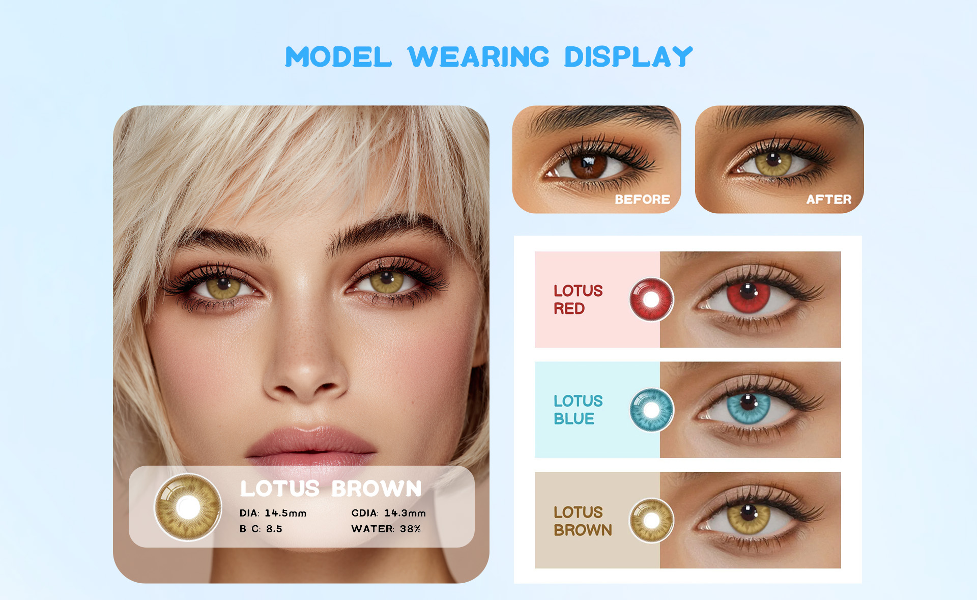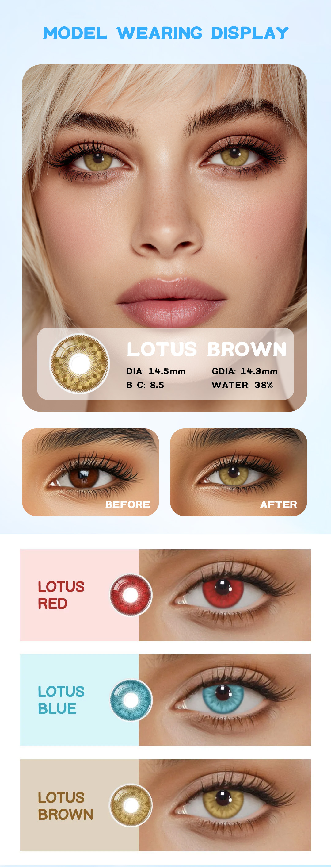Enhance your eyes with Eyemua Lotus Brown colored contact lenses, designed to create a natural, warm brown eye color. Ideal for fashion, everyday wear, cosplay, photoshoots, or special occasions, these lenses blend comfort and rich color intensity for a realistic yet captivating look. Available in yearly and monthly wear options, with non‑prescription (0.00/Plano) versions for cosmetic use, they offer an easy and stylish way to transform your eyes.