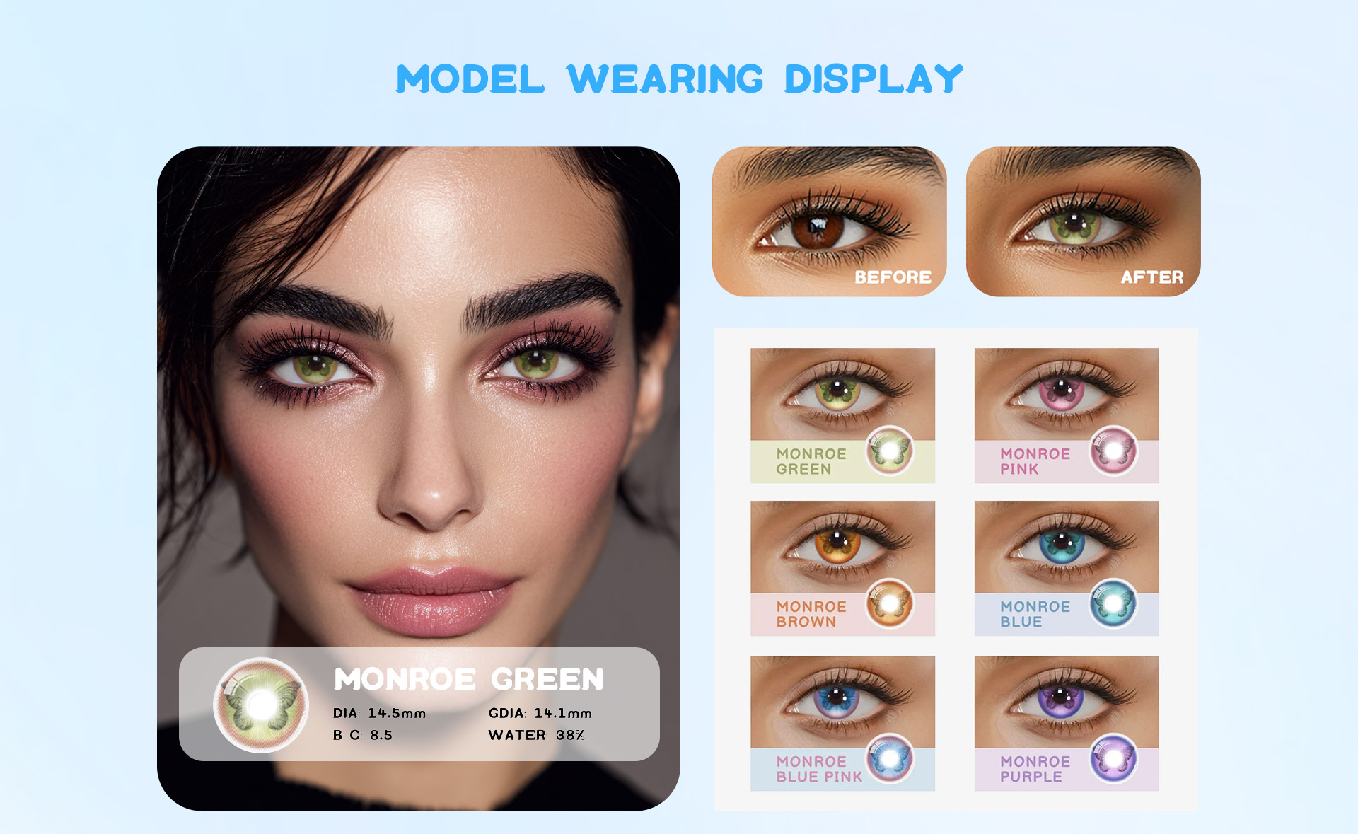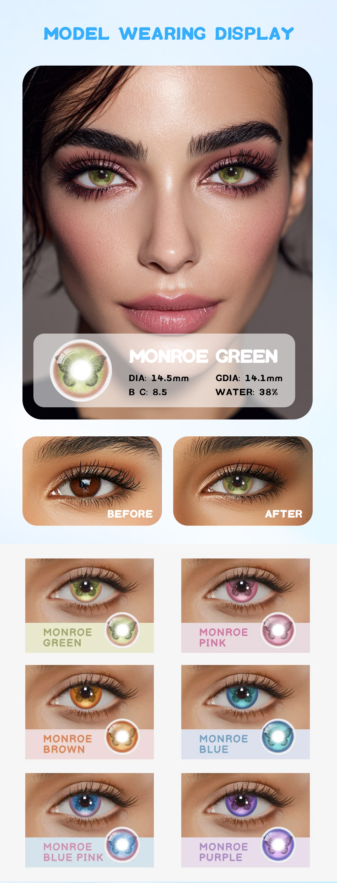 apture the allure of timeless beauty with Monroe Green contact lenses, featuring a stunning green hue that adds depth and sophistication to your eyes. These lenses create a mesmerizing, natural look with a subtle pop of color, perfect for enhancing your everyday style or bringing a vintage-inspired charm to your cosplay. Let Monroe Green elevate your gaze with an effortlessly elegant touch.