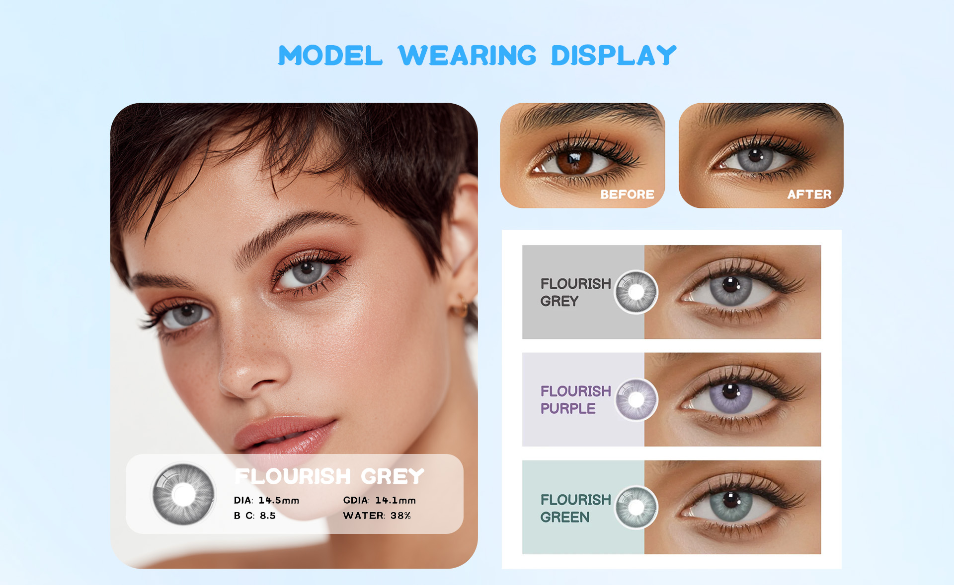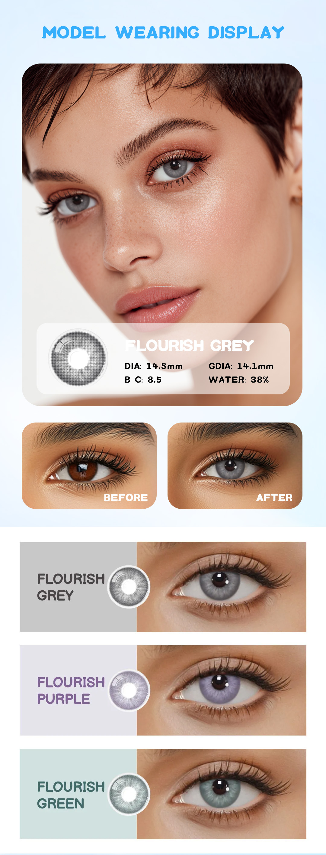 Embrace the essence of effortless elegance with Flourish Grey contact lenses, designed to enhance your natural beauty with a soft, subtle grey hue. These lenses blend seamlessly with your eye color, creating a fresh and airy look that feels both radiant and sophisticated. Let Flourish Grey bring a touch of grace to your gaze and illuminate your unique charm!
