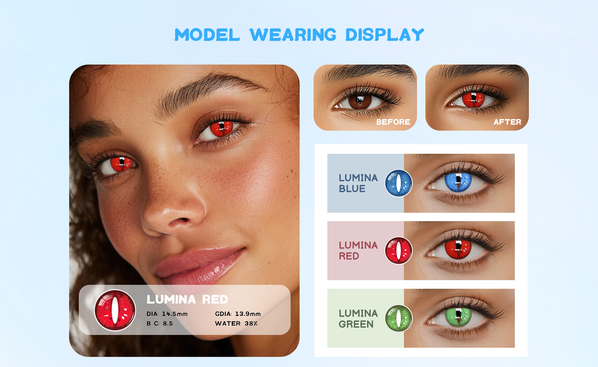 Entfache dein Cosplay mit Lumina Red Kontaktlinsen, die entwickelt wurden, um einen auffälligen und lebendigen roten Farbton zu liefern, der Aufmerksamkeit erregt. Diese mutigen Linsen verleihen deinem Charakter einen elektrisierenden Touch, perfekt, um furchtlose Helden oder fesselnde Bösewichte zum Leben zu erwecken. Umfange die Kraft von Lumina Red und lass deine Augen in jeder Darbietung ein dramatisches Statement setzen!