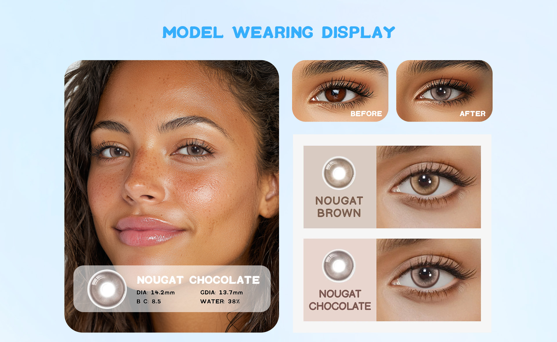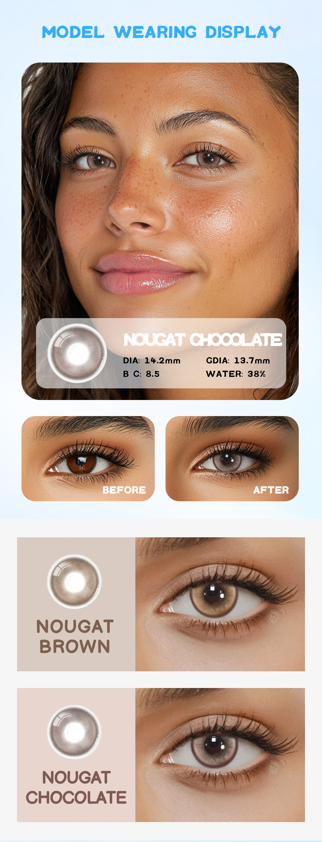 Eyemua Nougat Chocolate lenses feature a deeper brown shade with subtle golden undertones and smooth iris blending.