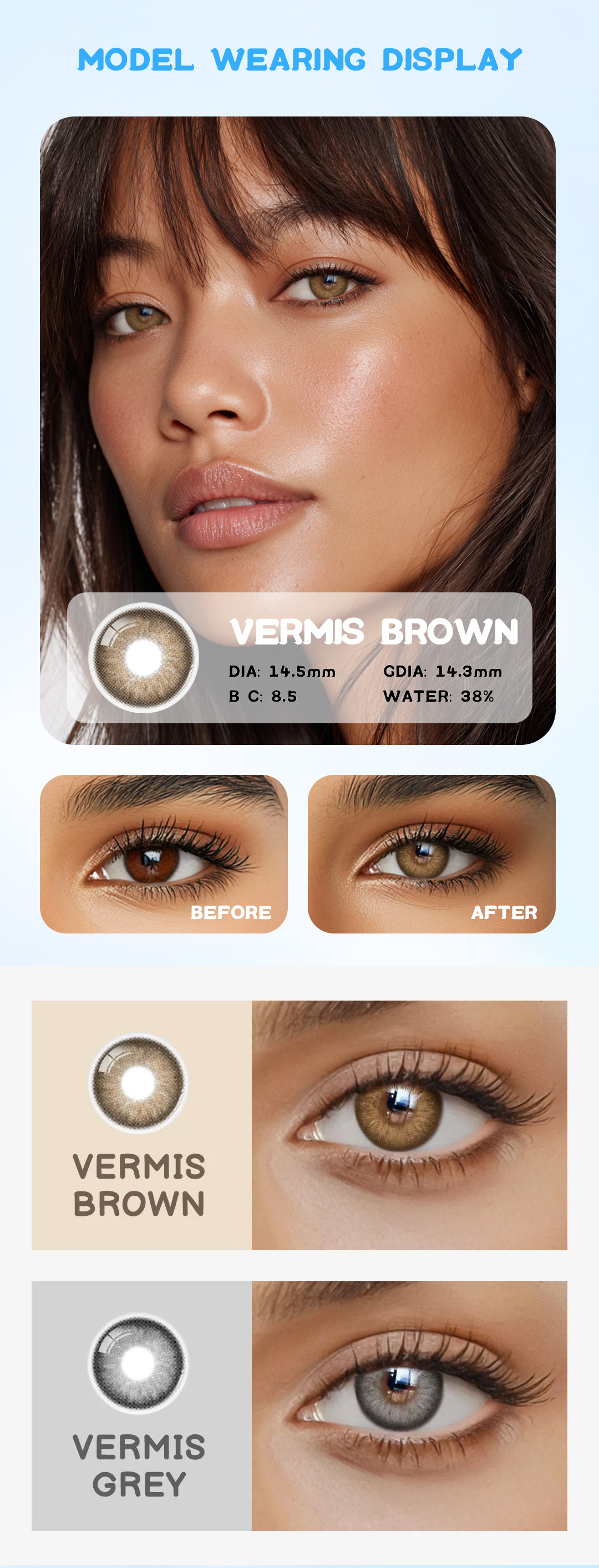 Achieve a warm, natural look with Vermis Brown contact lenses, featuring a rich, earthy brown shade that enhances the depth and radiance of your eyes. These lenses offer a soft, subtle hue, creating an effortlessly beautiful and natural appearance. Perfect for adding warmth and dimension to your gaze, Vermis Brown complements any style with its timeless elegance.