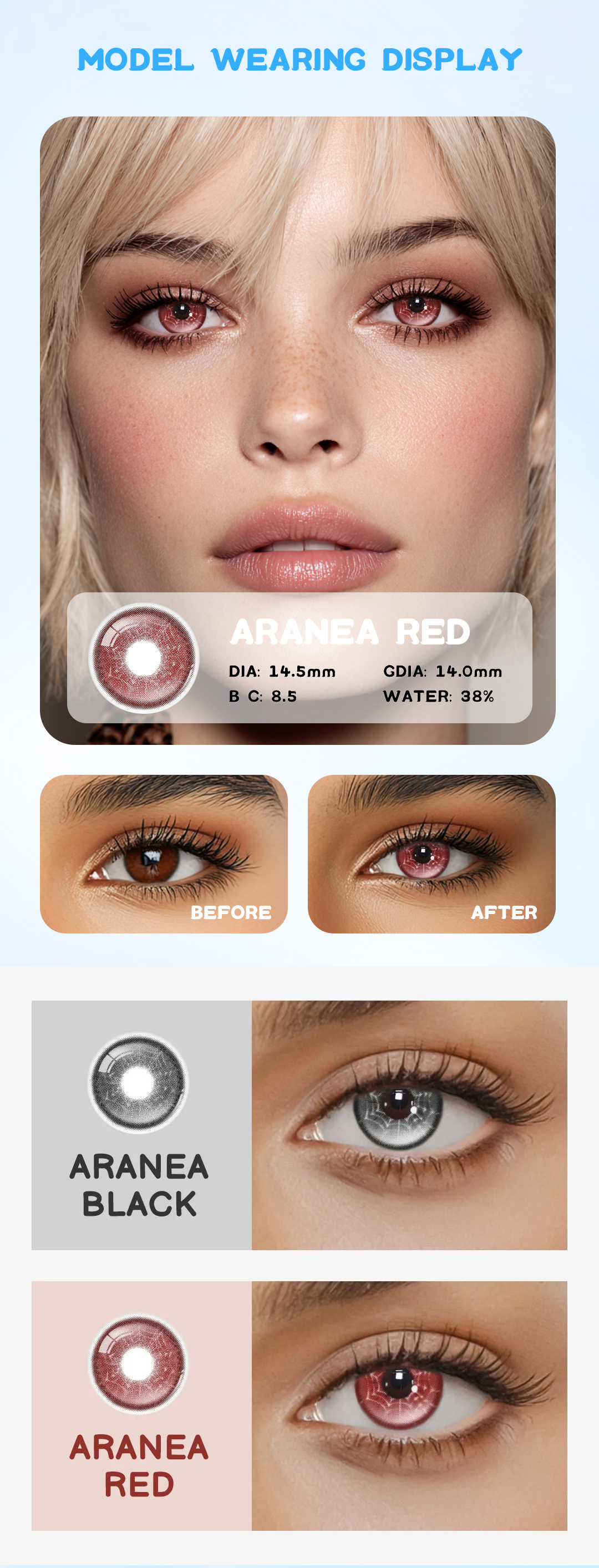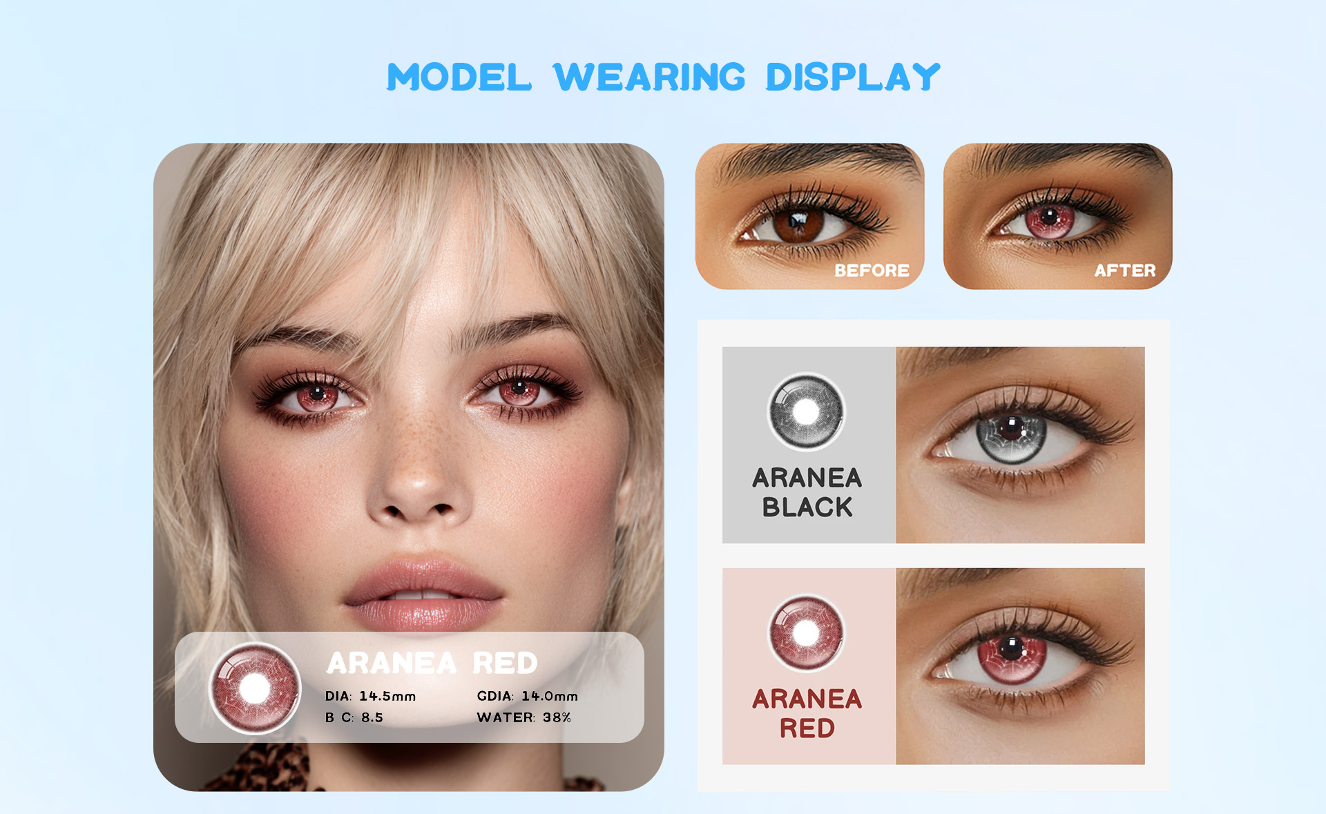 Las lentes Eyemua Aranea Red crean un tono rojo vívido y ardiente que realza tu mirada con un aspecto audaz y llamativo, todo mientras proporciona hidratación y comodidad.