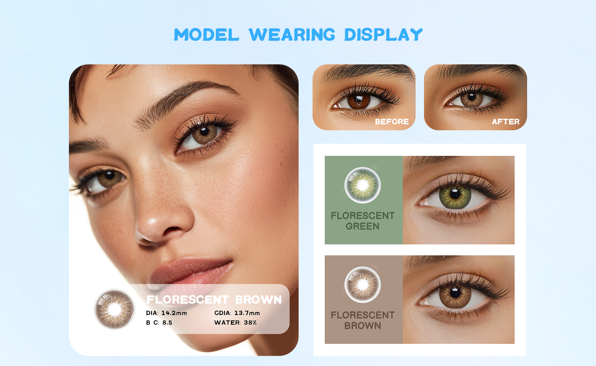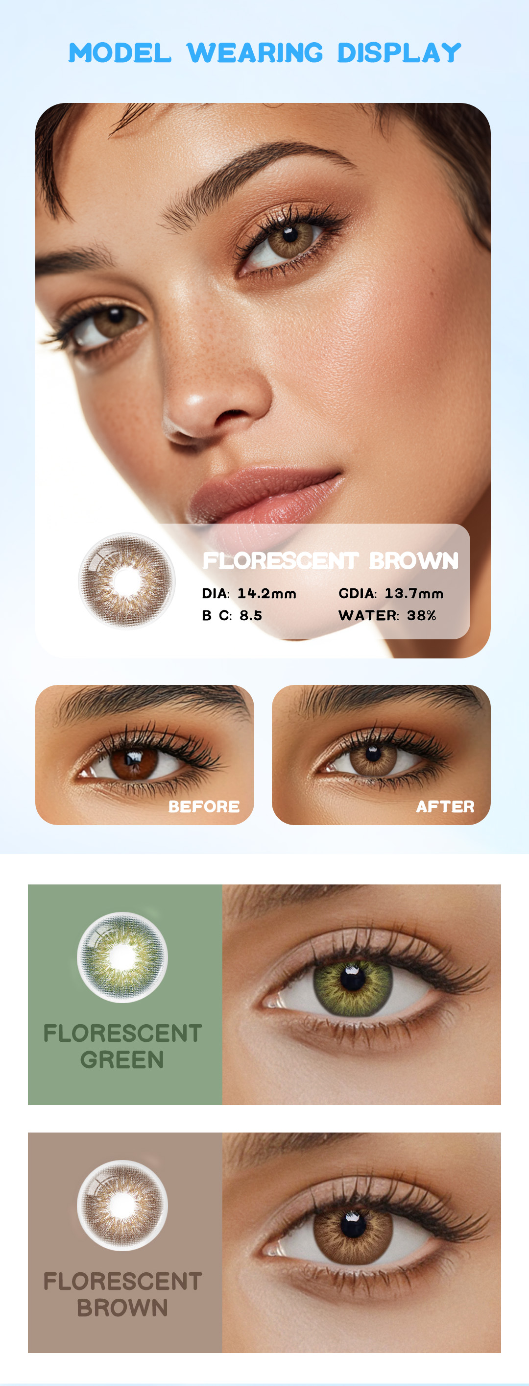 Suitable for both light and dark eyes, the soft brown tone blends seamlessly to enhance your natural features. With a subtle fluorescent glow, these lenses add depth, liveliness, and a charming sparkle to every look.