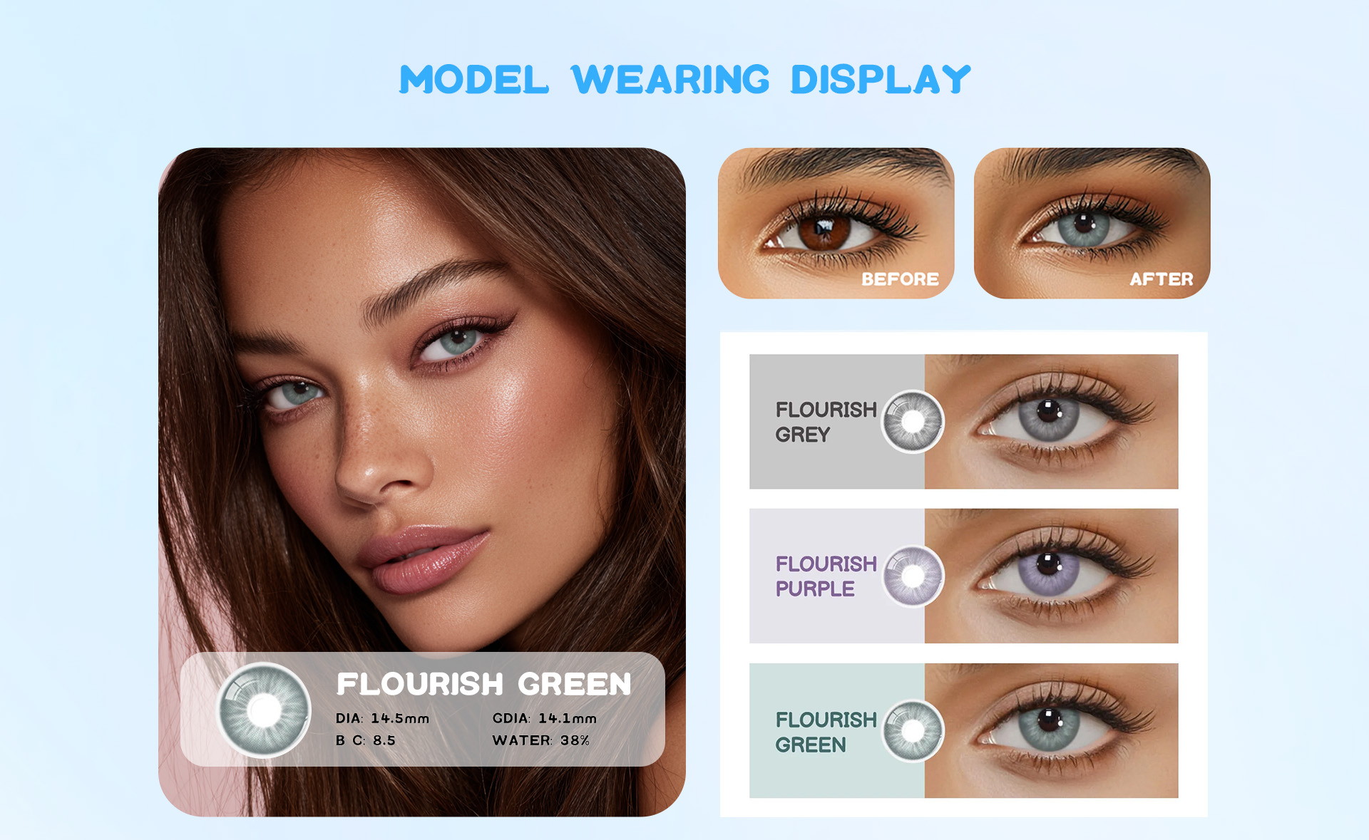 Illuminate your look with Flourish Green contact lenses, designed to enhance your natural beauty with a soft, refreshing green hue. These lenses seamlessly blend with your eyes, adding a touch of vibrant color that feels effortlessly natural. Embrace the enchanting allure of Flourish Green and let your eyes radiate freshness and charm!