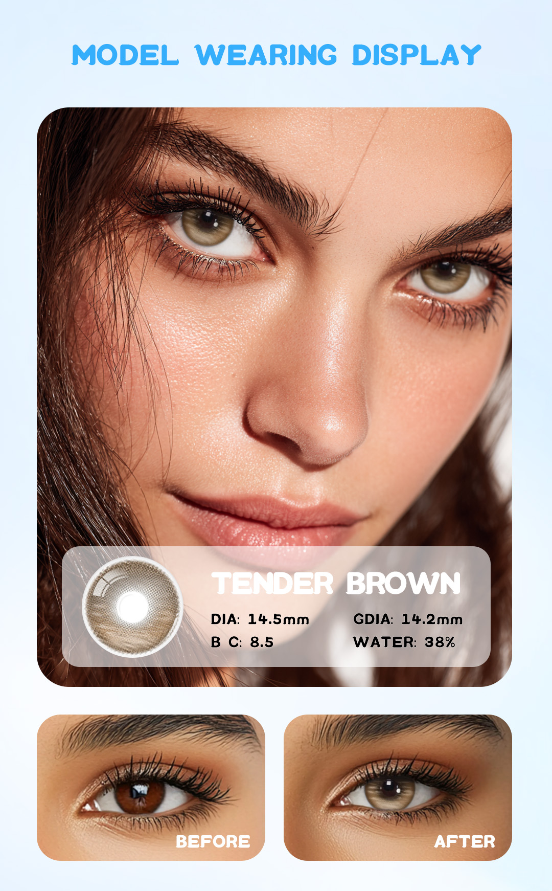 Eyemua Tender Brown lenses feature a smooth, medium brown hue that provides natural depth while maintaining hydration and comfort all day long.
