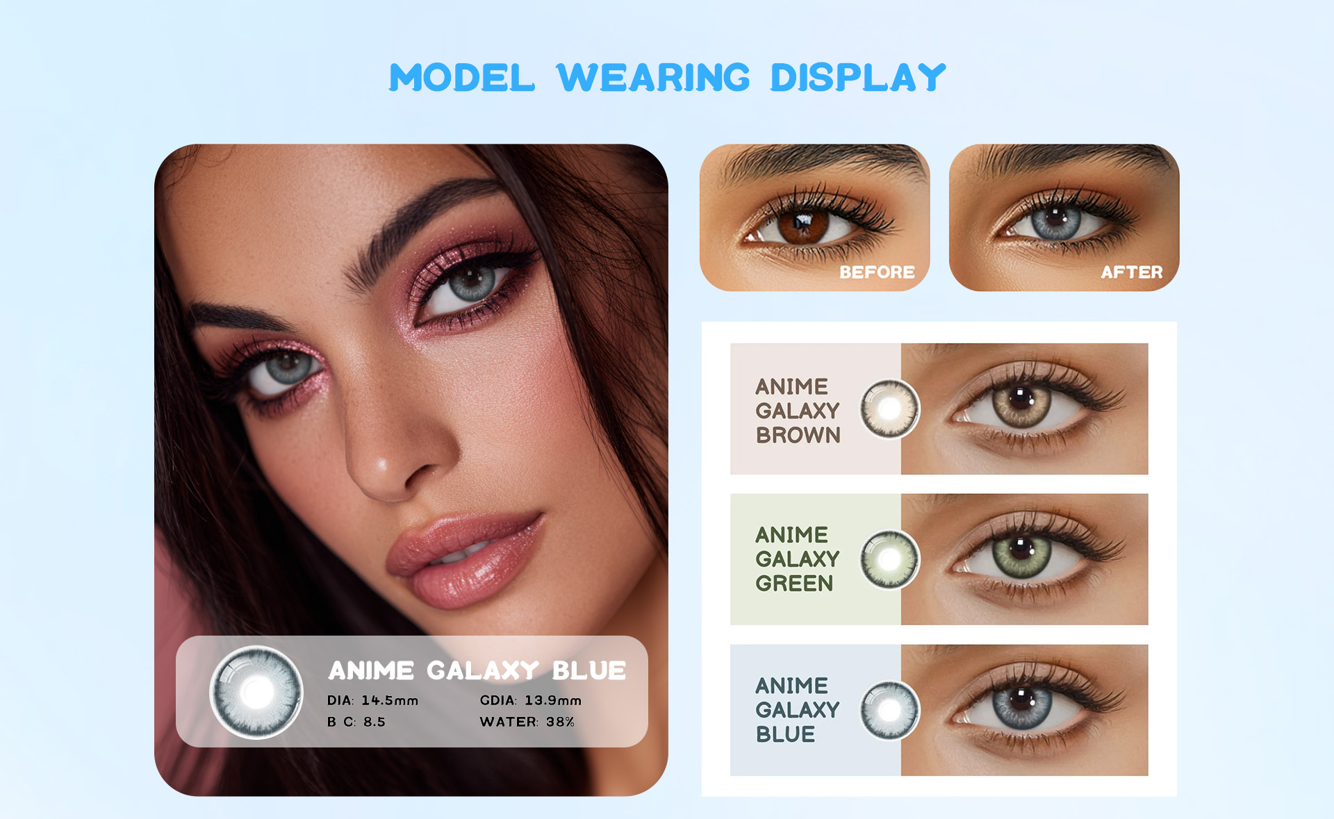 Inspired by the vastness of the starry sky and the magical world of anime,Galaxy Blue brings a unique light blue shade to your eyes, as if capturing the brilliance and depth of the Milky Way. The soft blue is adorned with a gradient starry effect, making your eyes look deep and dreamy. Whether day or night, these lenses let your eyes shine charmingly, like the brightest star in the night sky.