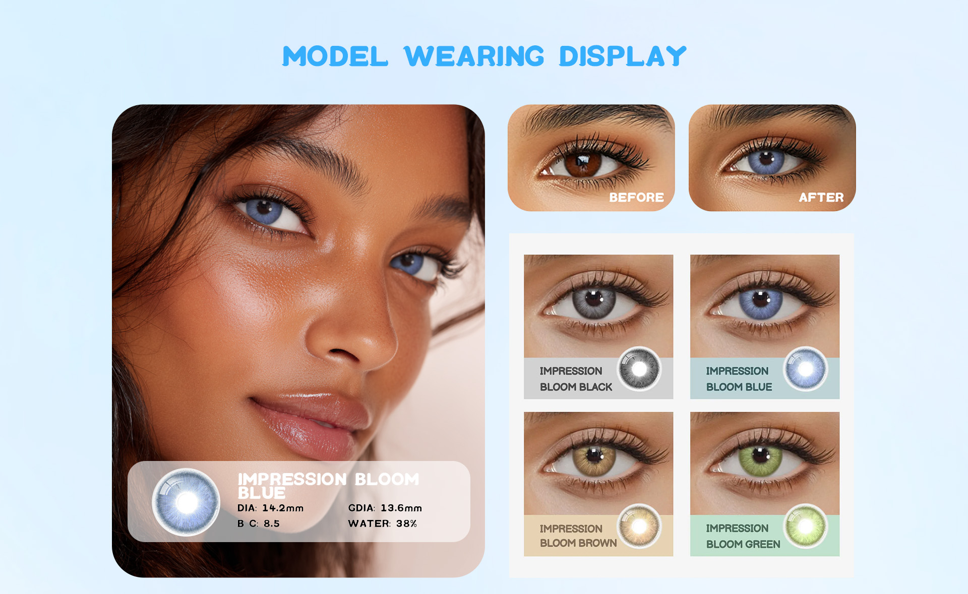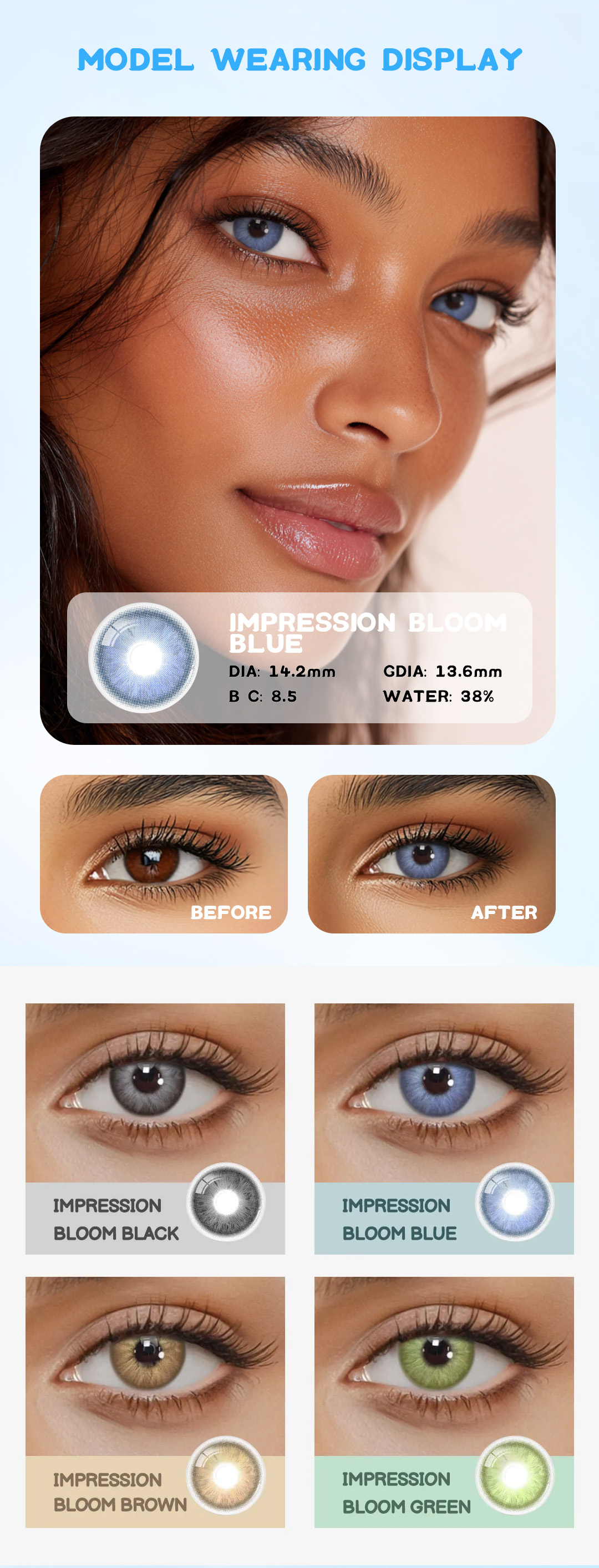 Awaken your eyes with Impression Bloom contact lenses in a refreshing blue hue, designed to bring a lively and vibrant touch to your look. These lenses enhance your natural beauty, creating a bright and captivating gaze that draws attention and exudes freshness. Embrace the invigorating charm of Impression Bloom and let your eyes shine with a burst of enchanting blue!