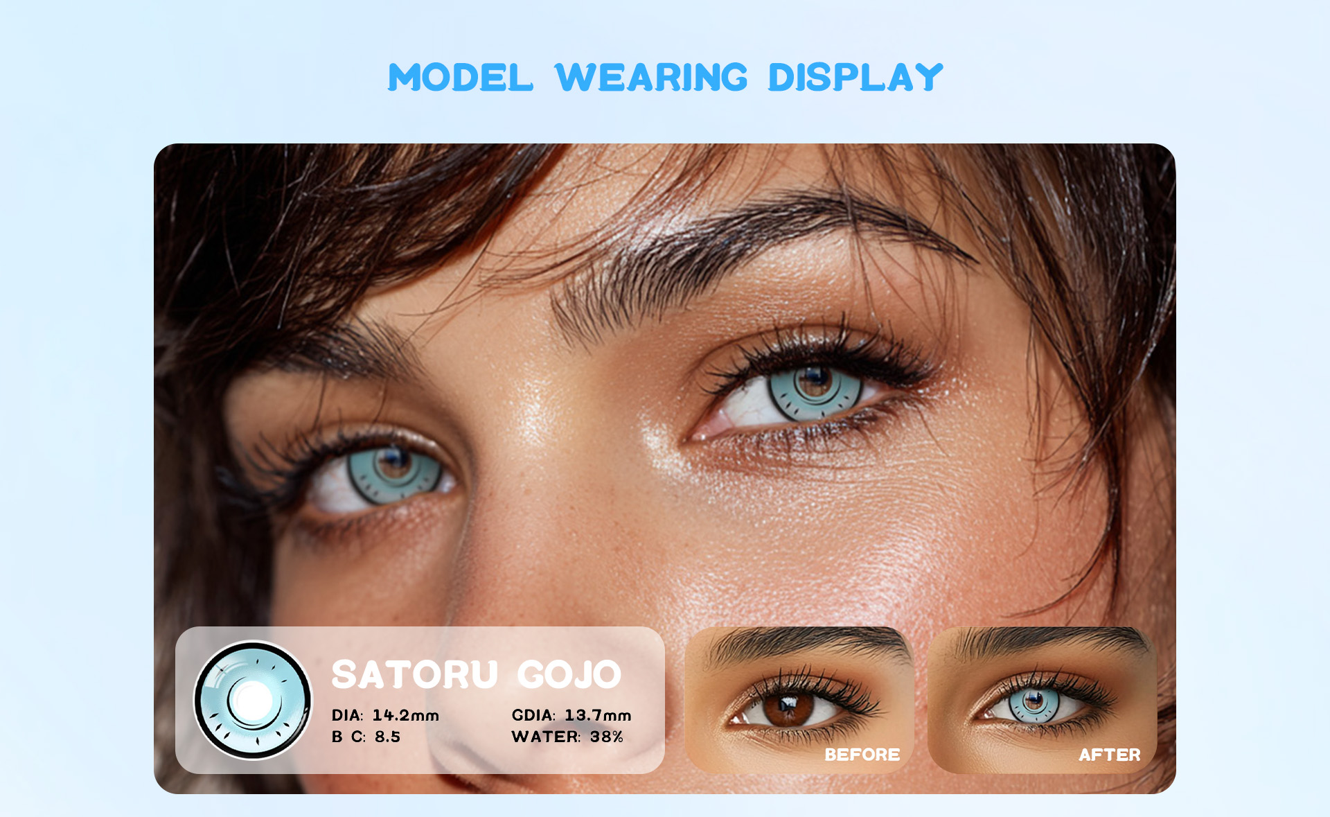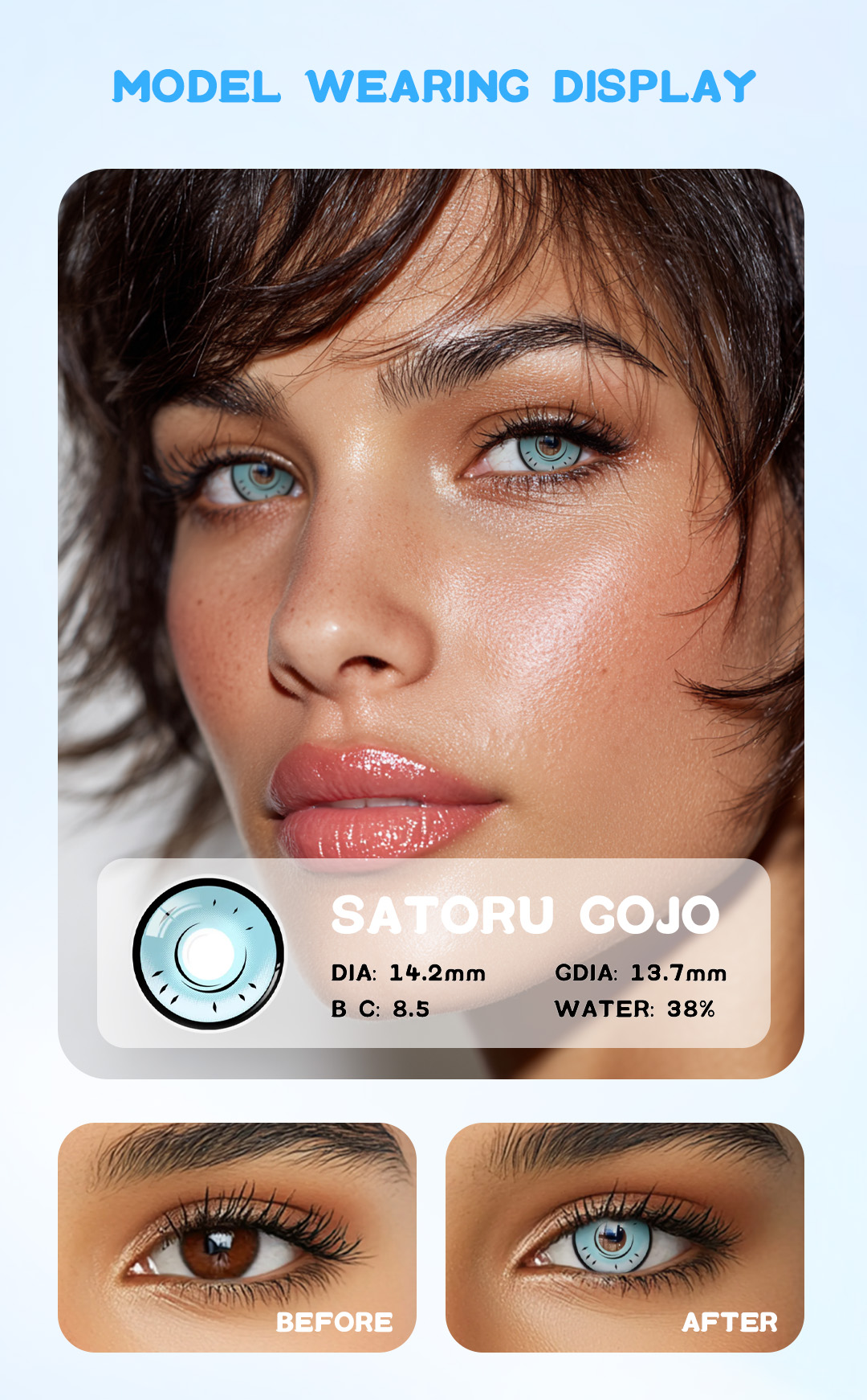 Capture the essence of the powerful sorcerer with Satoru Gojo contact lenses, designed to elevate your cosplay with striking clarity and depth. These lenses enhance your look with a vivid blue hue that mirrors Gojo's captivating gaze, perfect for bringing this iconic character to life. Embrace the charisma and strength of Satoru Gojo and let your eyes become the focal point of your cosplay transformation!