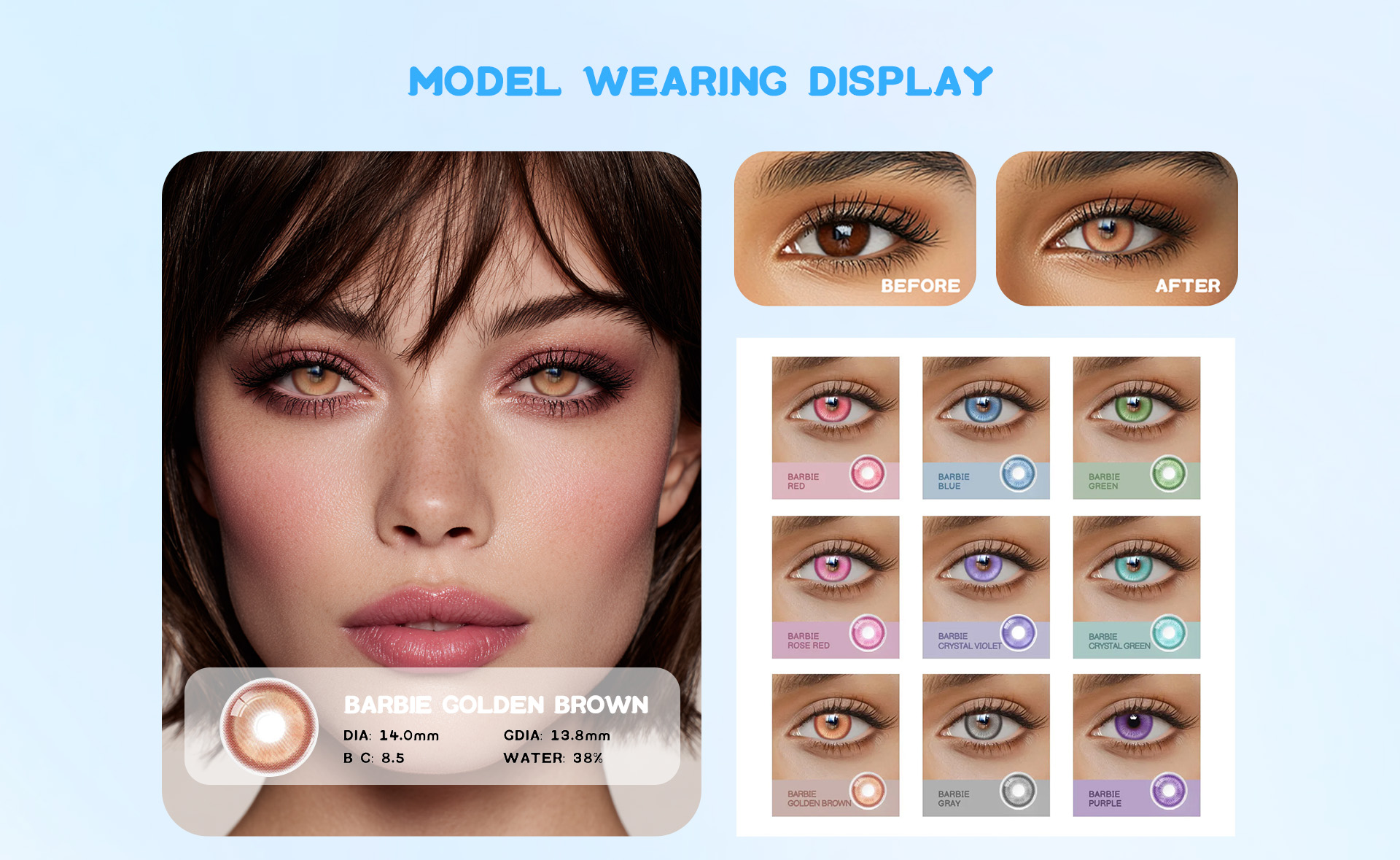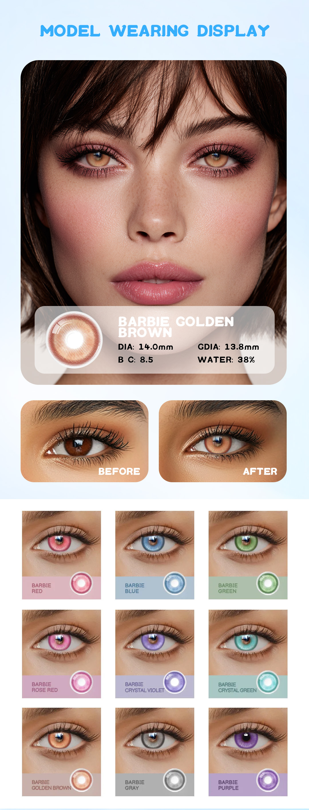 3.Radiate warmth with Eyemua Barbie Golden Brown contact lenses, featuring a glowing golden-brown shade that adds depth and a sweet, doll-like charm to your eyes. The soft yet luminous tones enhance your natural beauty, making your gaze appear brighter, larger, and full of gentle allure. Perfect for everyday wear or special occasions, Barbie Golden Brown brings a warm and enchanting finish to your style.