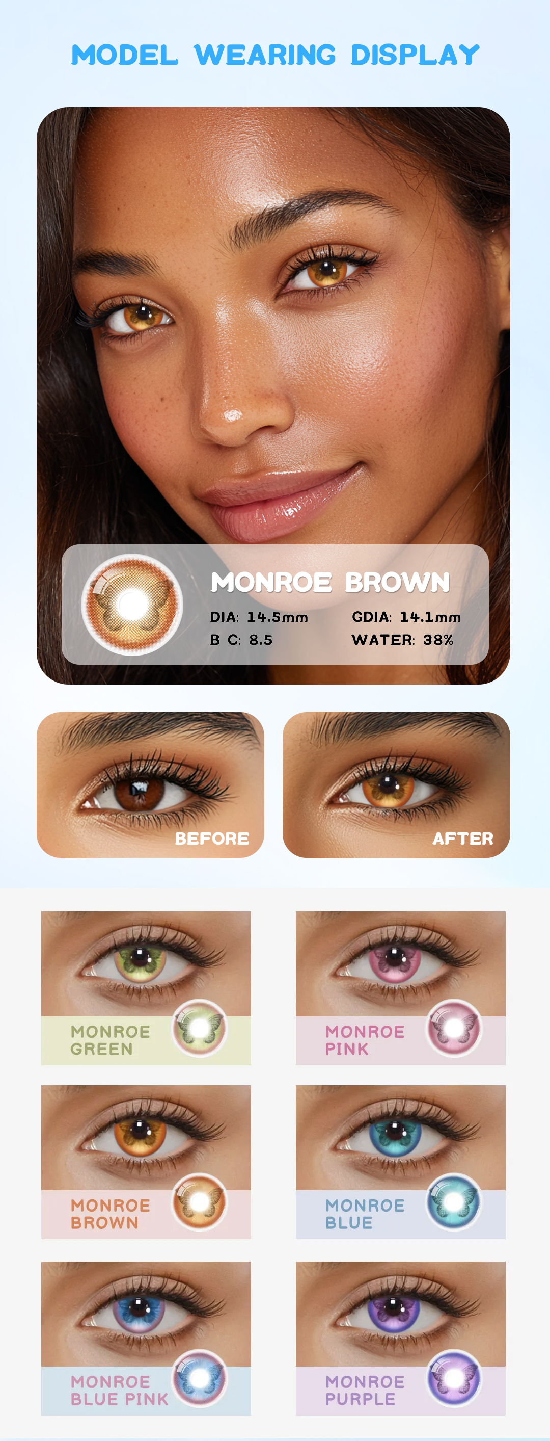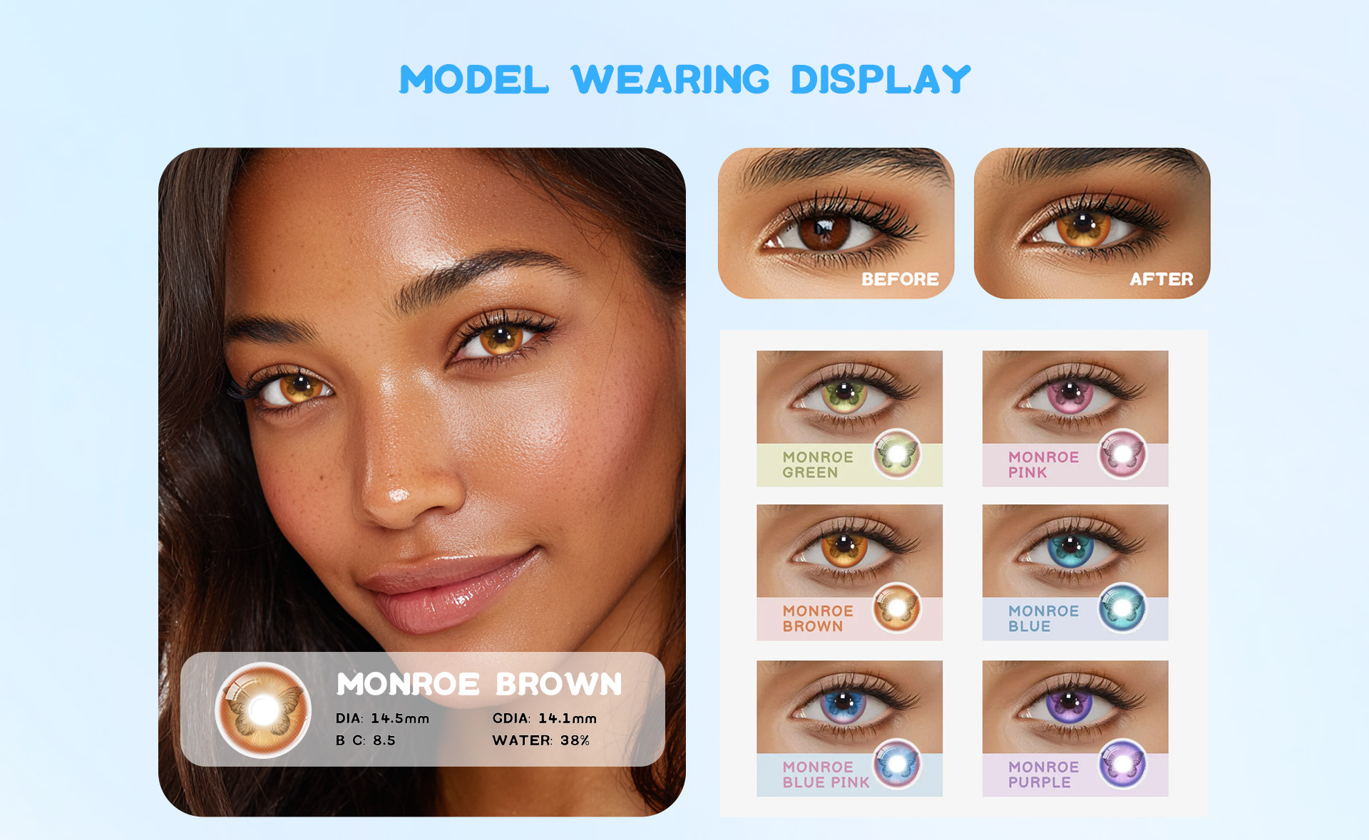 apture the allure of timeless beauty with Monroe Brown contact lenses, featuring a stunning green hue that adds depth and sophistication to your eyes. These lenses create a mesmerizing, natural look with a subtle pop of color, perfect for enhancing your everyday style or bringing a vintage-inspired charm to your cosplay. Let Monroe brown elevate your gaze with an effortlessly elegant touch.