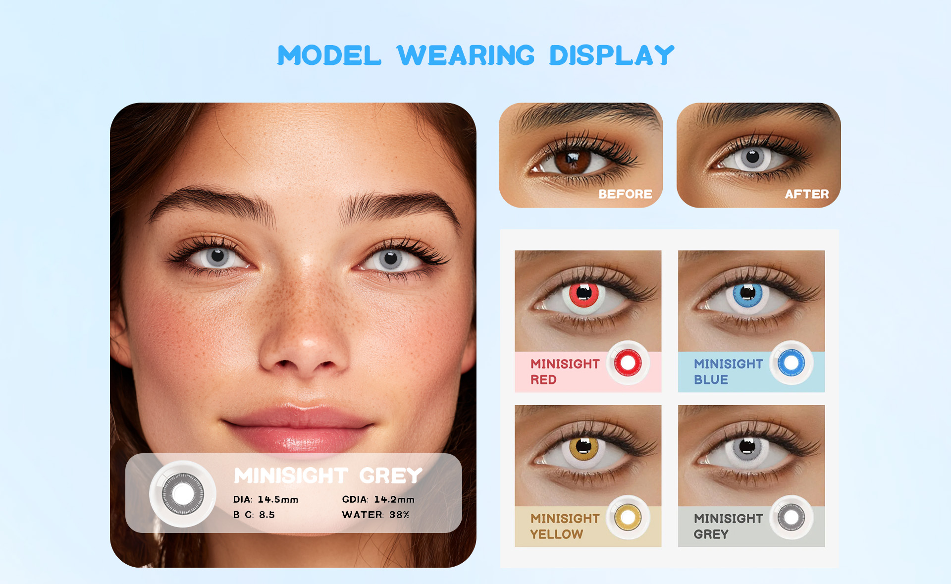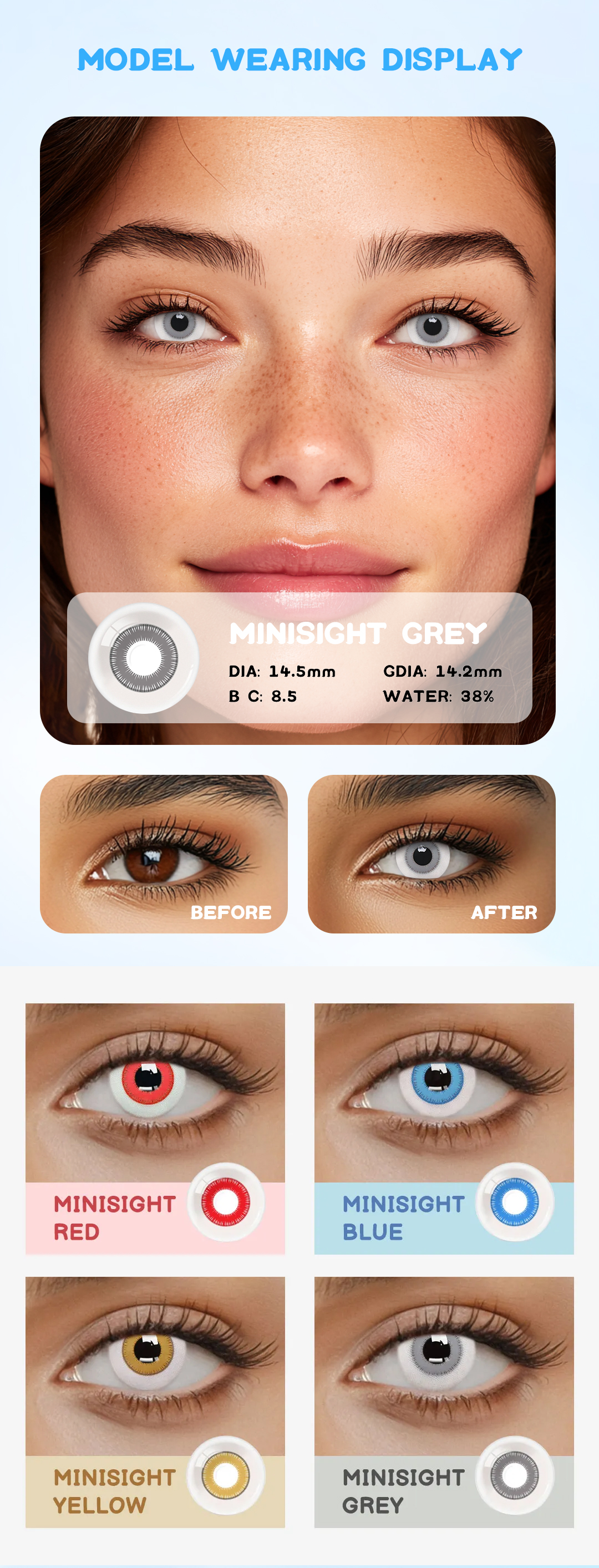 Elevate your look with Eyemua’s Minisight Grey contact lenses, designed to enlarge your eyes with a sleek, sophisticated grey hue. These lenses add a touch of mystery and depth, perfect for creating a captivating, enigmatic appearance. Embrace the alluring charm of Minisight Grey and let your eyes shine with subtle intensity and undeniable elegance!