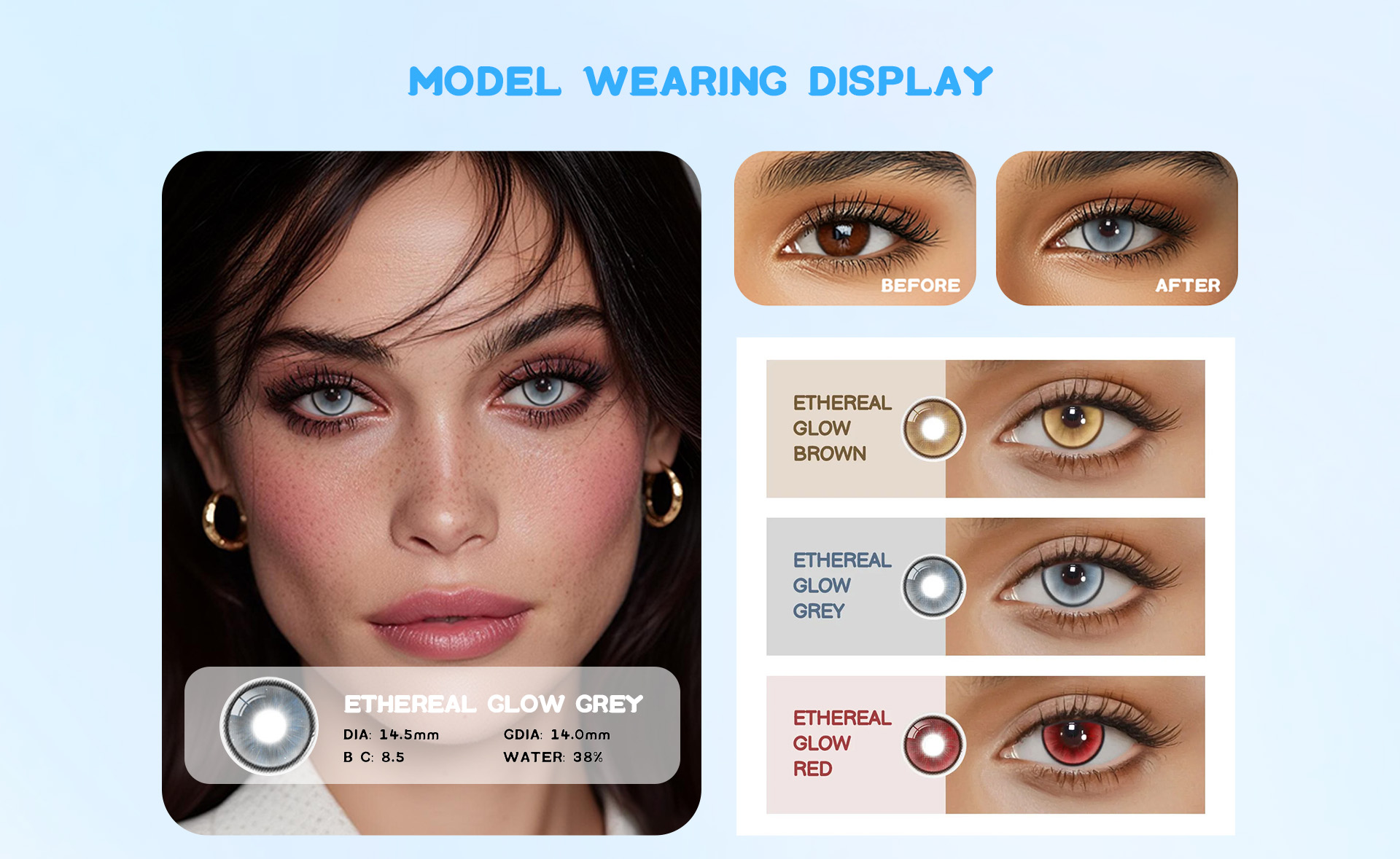 Eyemua Ethereal Glow Grey lenses offer a subtle, glowing grey color, enhancing your eyes with a soft and dreamy effect, while ensuring comfort and hydration all day.