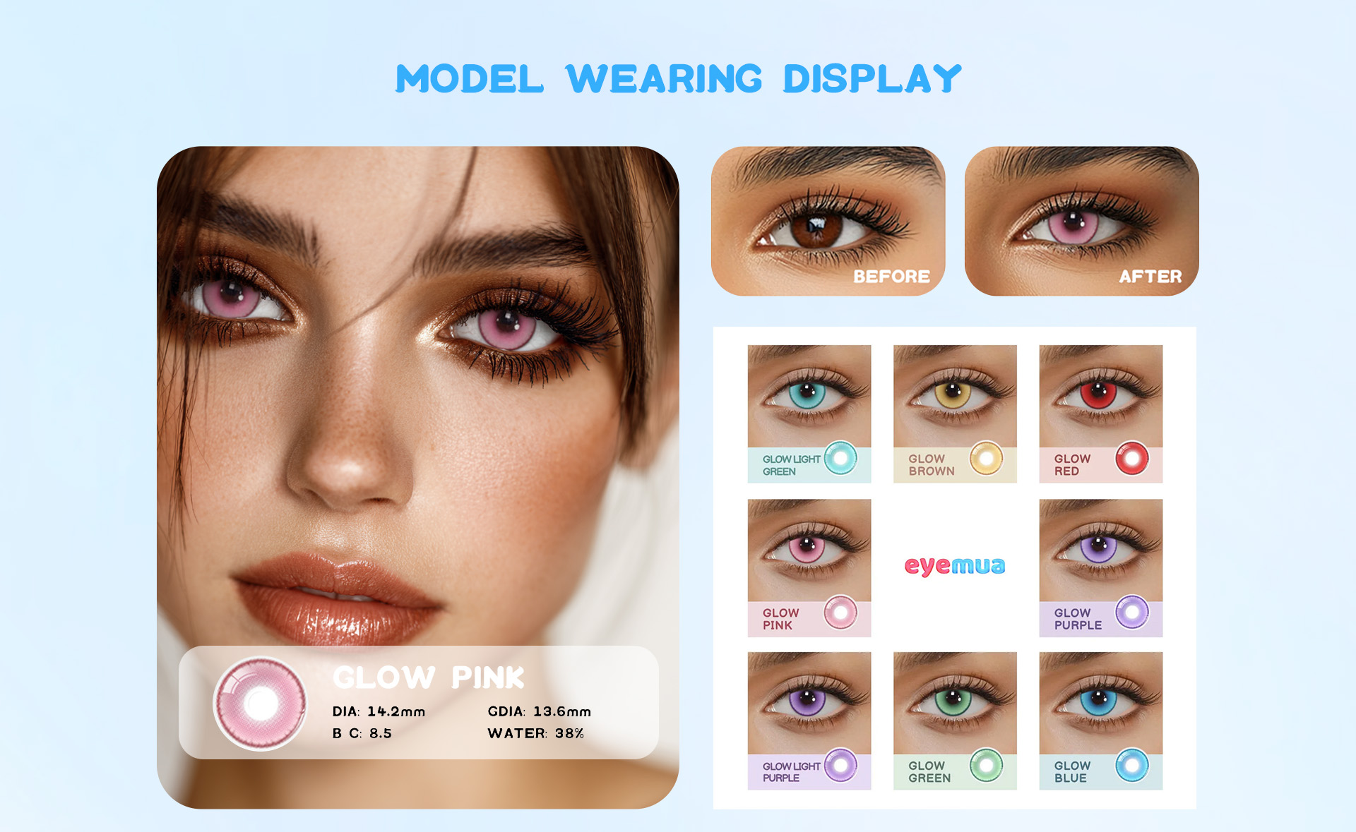 Illuminate your eyes with Glow Pink contact lenses, featuring a brilliant blue hue that creates a striking, radiant effect. These lenses enhance your natural beauty with a vibrant pop of color, perfect for making your eyes the center of attention. Whether for cosplay or everyday wear, Glow Pink adds a mesmerizing, glowing allure to your gaze.