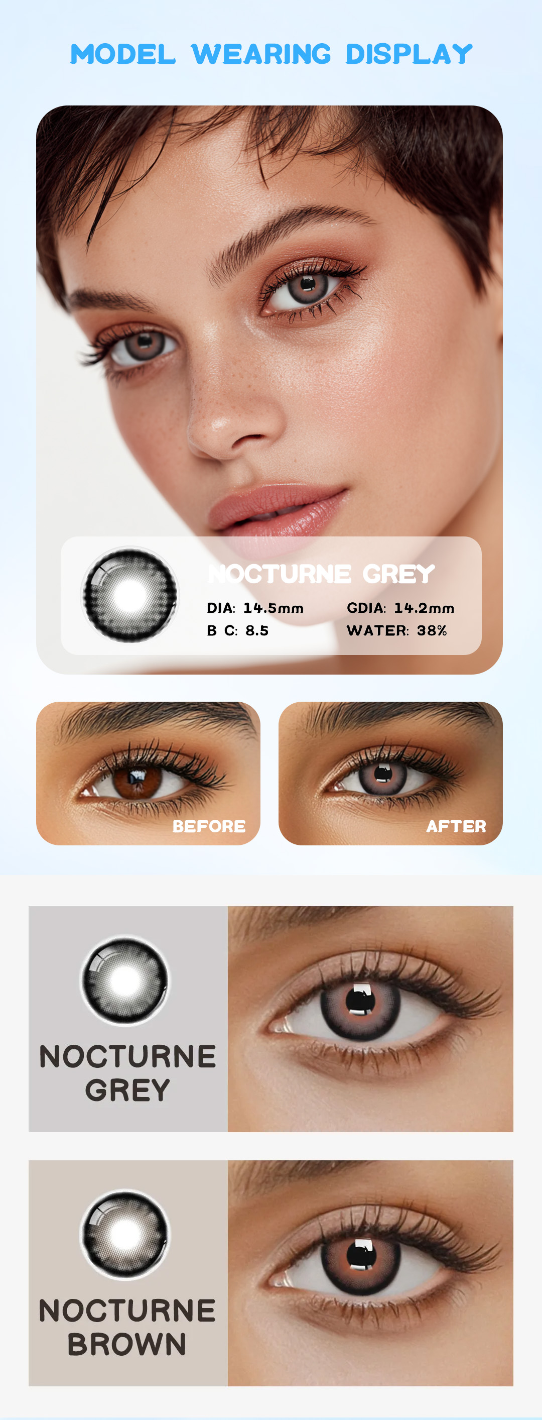 Elevate your style with Eyemua’s Nocturne Grey contact lenses, designed to enlarge your eyes with a sleek, dark grey hue. These lenses create a captivating and mysterious look, perfect for adding depth to your eyes and achieving an effortlessly dramatic appearance. Embrace the allure of Nocturne Grey and let your eyes captivate with a bold, refined edge!