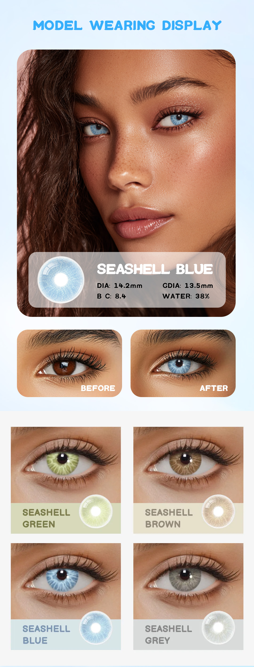 Experience the serene elegance of Eyemua Seashell Blue lenses. Featuring soft, ocean-inspired blue tones with subtle shading, these lenses create a naturally captivating look. The Seashell pattern adds depth and dimension for realistic eyes with a gentle sparkle. Crafted from lightweight, breathable materials, these lenses ensure all-day comfort and optimal moisture retention. Perfect for everyday wear or special occasions, Eyemua Seashell Blue delivers clarity, comfort, and an effortlessly enchanting gaze.