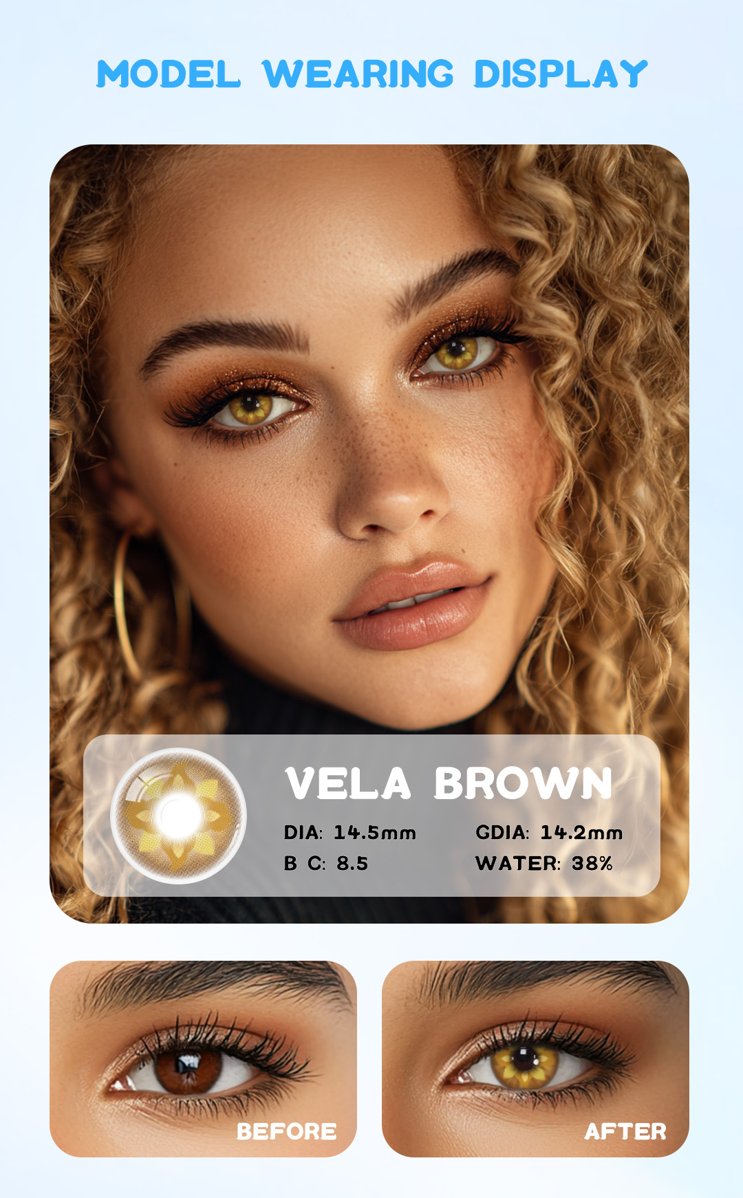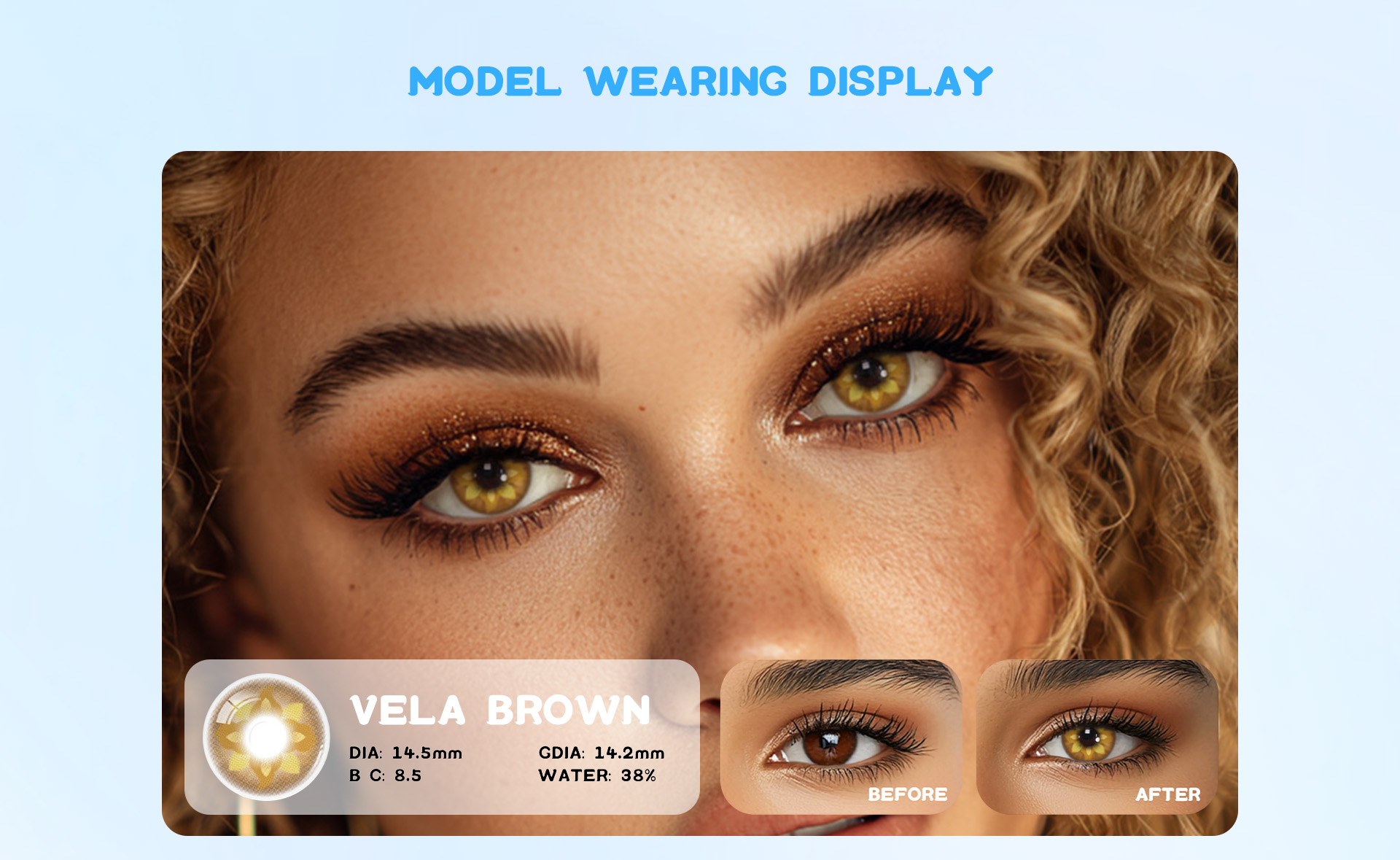 Eyemua Vela Brown lenses blend starry undertones with warm brown hues, creating an enchanting effect that remains comfortable for hours.