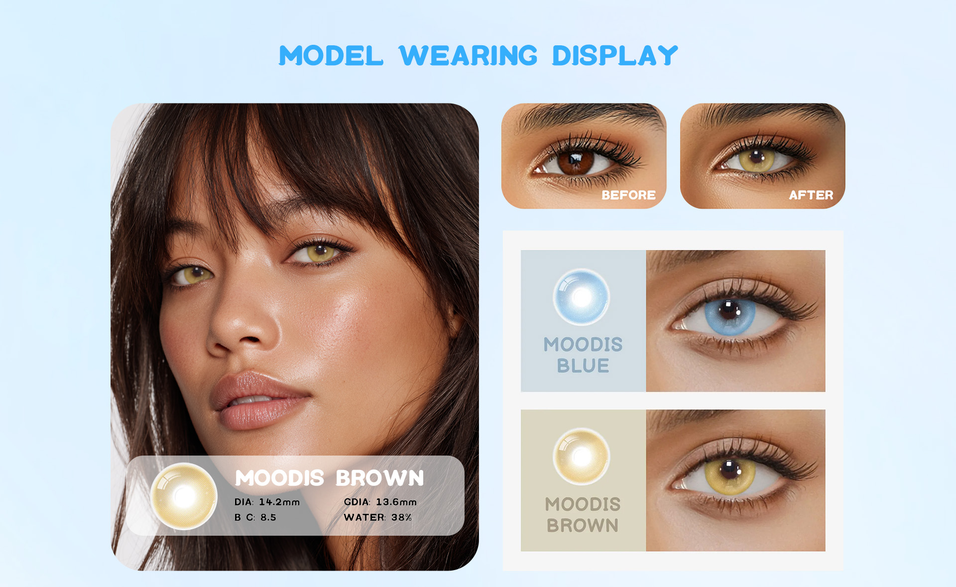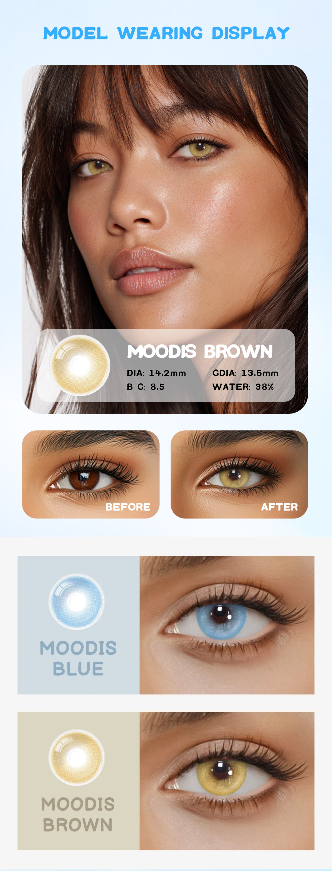 3.Brighten your gaze with Eyemua Moodis Brown contact lenses. Featuring a lighter brown shade, these lenses illuminate your eyes with a fresh and lively charm while keeping a natural finish. Perfect for daily wear, social moments, or adding a radiant touch to your style, Moodis Brown makes your eyes look warm, vibrant, and effortlessly captivating.