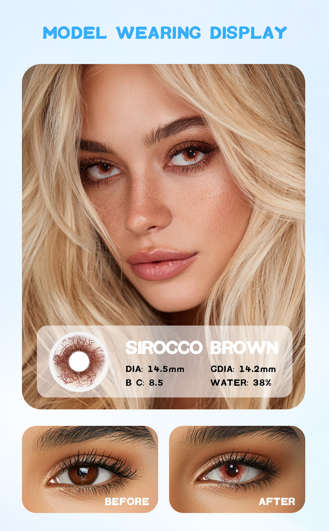 Eyemua Sirocco Brown lenses deliver a bold, warm brown hue with high contrast and sharp iris accents, enhancing any dramatic or fantasy role.