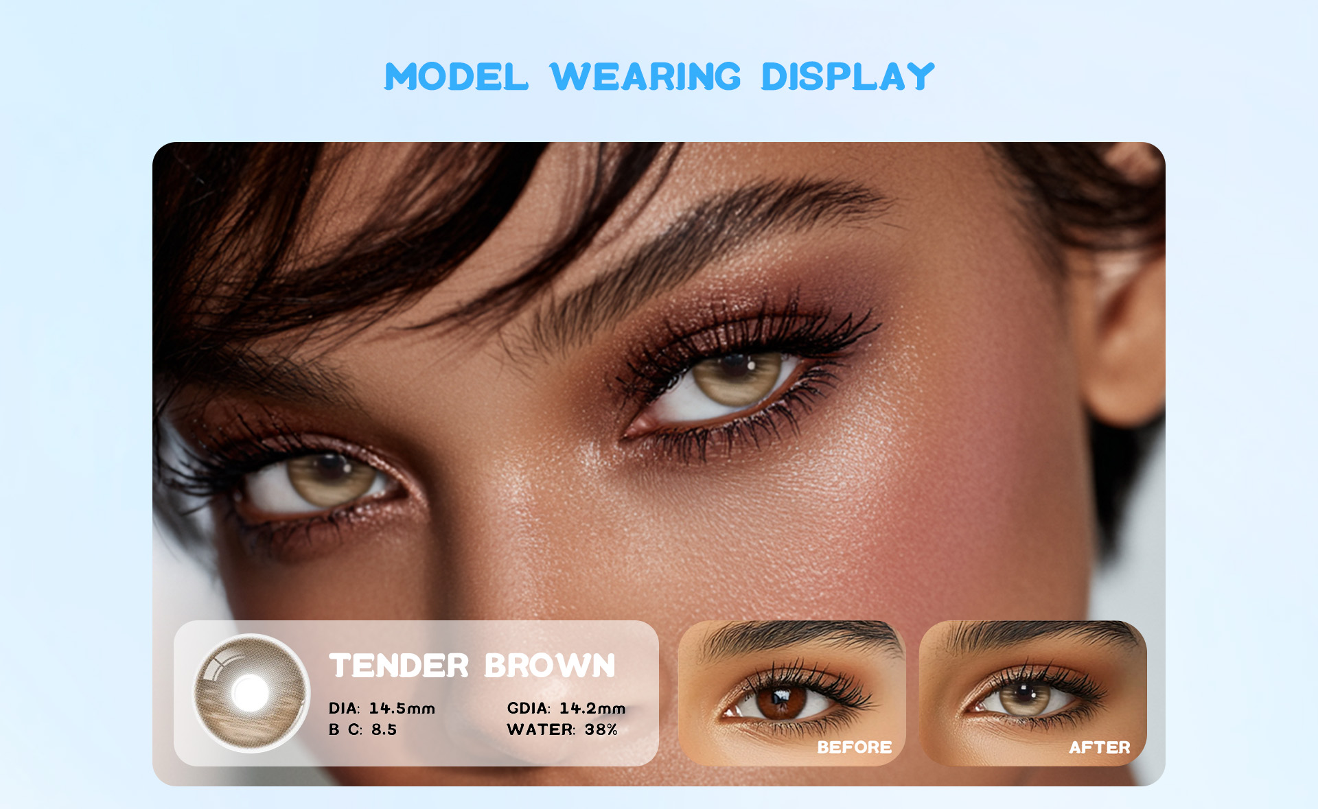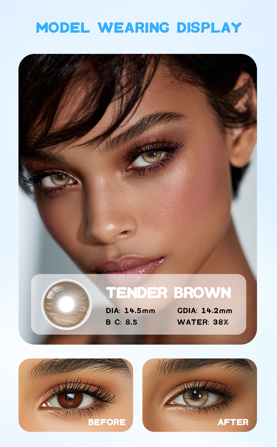 Eyemua Tender Brown contact lenses feature a soft, medium-brown tone that enhances your natural eyes with warmth and depth. Designed for all-day comfort, they offer excellent breathability and moisture retention, making them perfect for daily wear or special occasions.